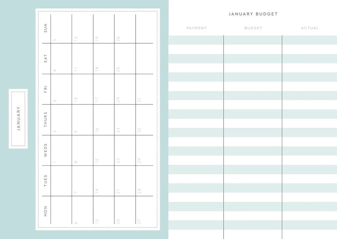 • Year to view, monthly planner, monthly "things of importance" page, monthly budget