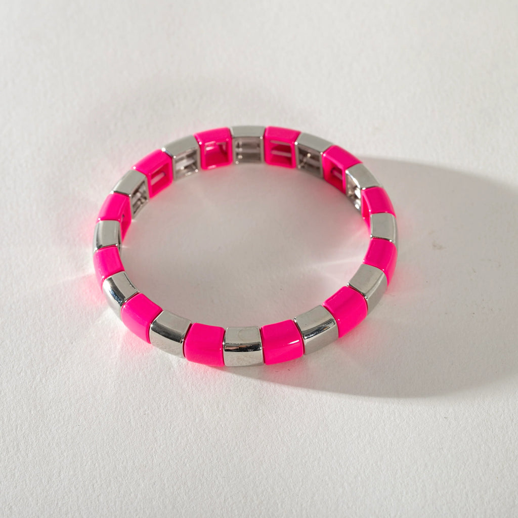 Silver Enamel Stacking Bracelet - Stripe Rounded Hot Pink/Silver