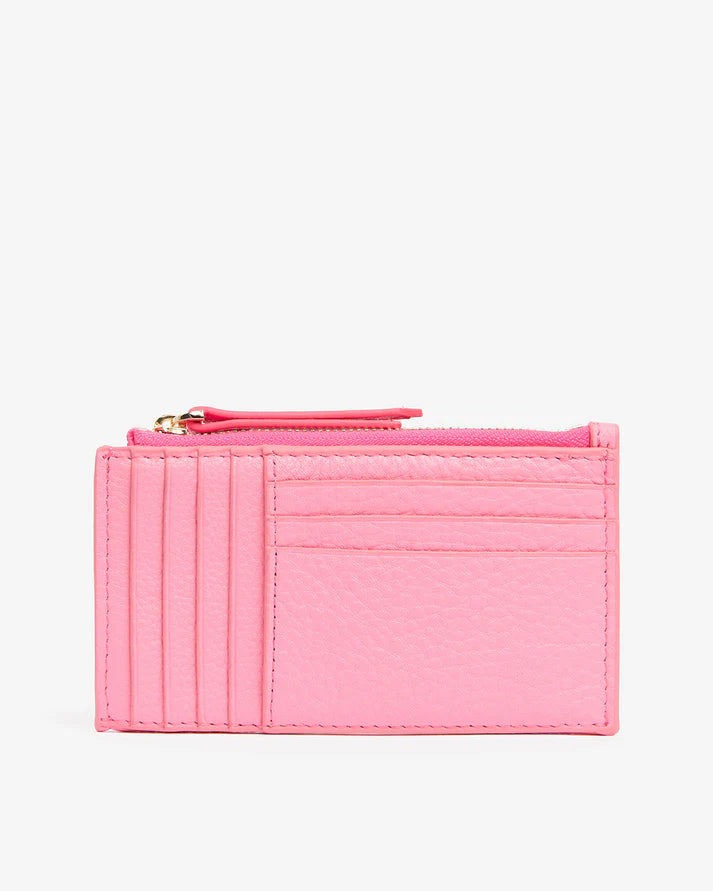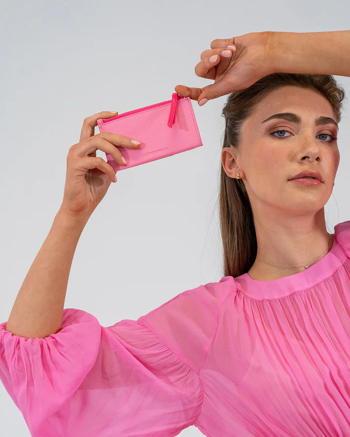 The Arlington Milne Compact Wallet is crafted from premium leather. The top zipper features a leather zipper pull and opening side gusset for ease of access. The interior is lined with Arlington Milnes signature hot pink twill and has 8 rear mounted leather card slots.