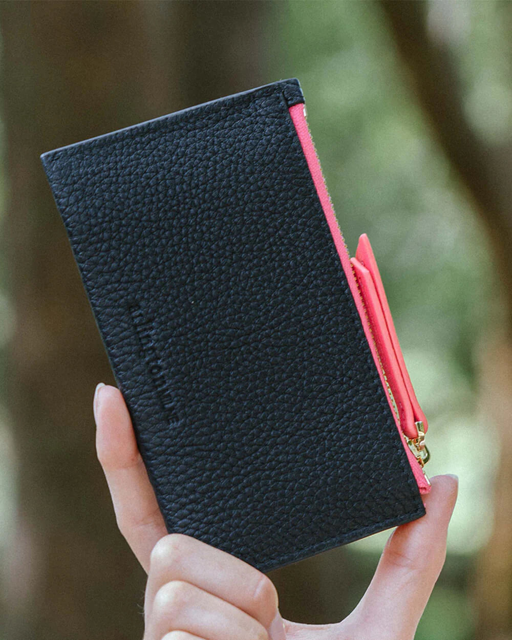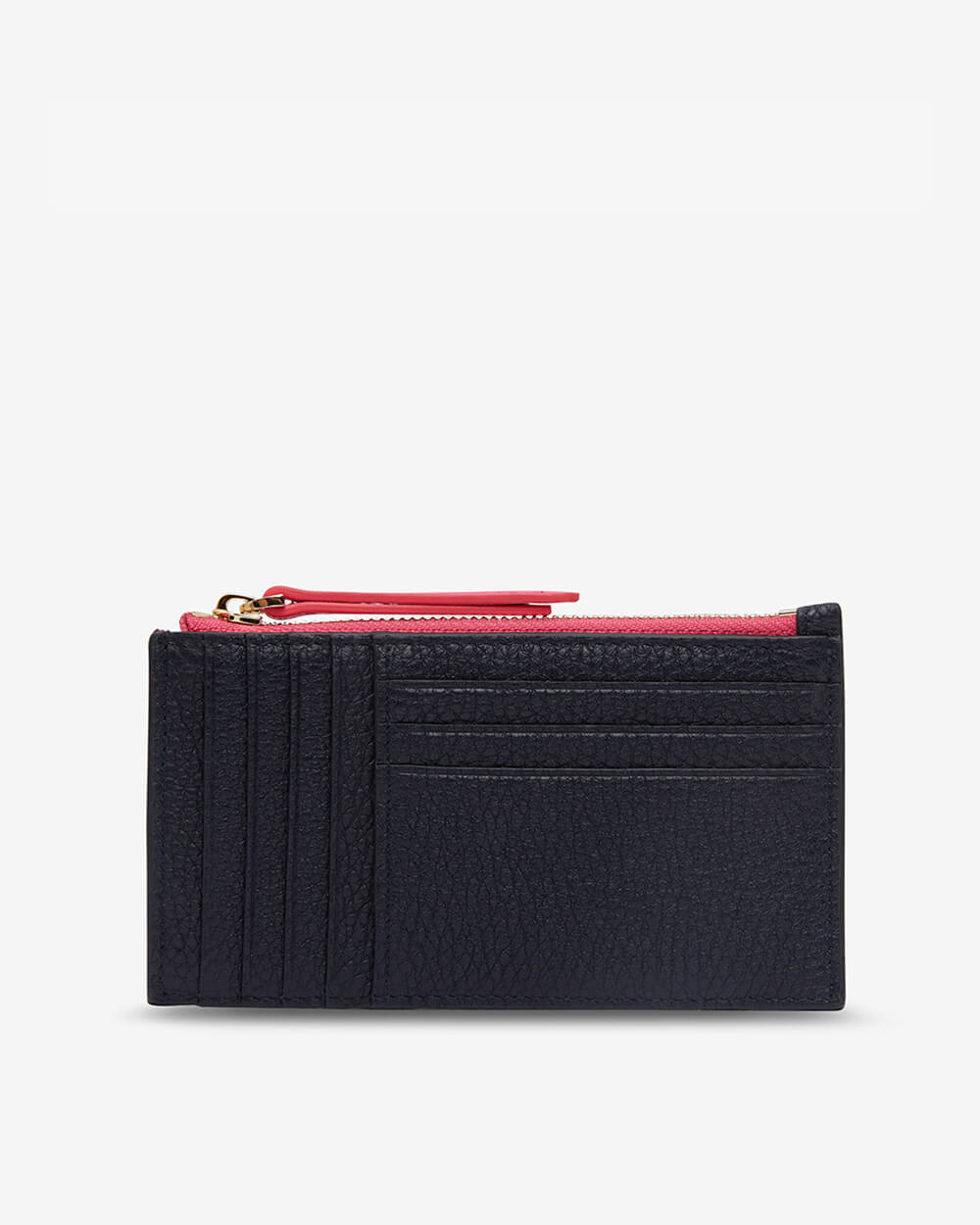 The Arlington Milne Compact Wallet is crafted from premium leather. The top zipper features a leather zipper pull and opening side gusset for ease of access. The interior is lined with Arlington Milnes signature hot pink twill and has 8 rear mounted leather card slots.