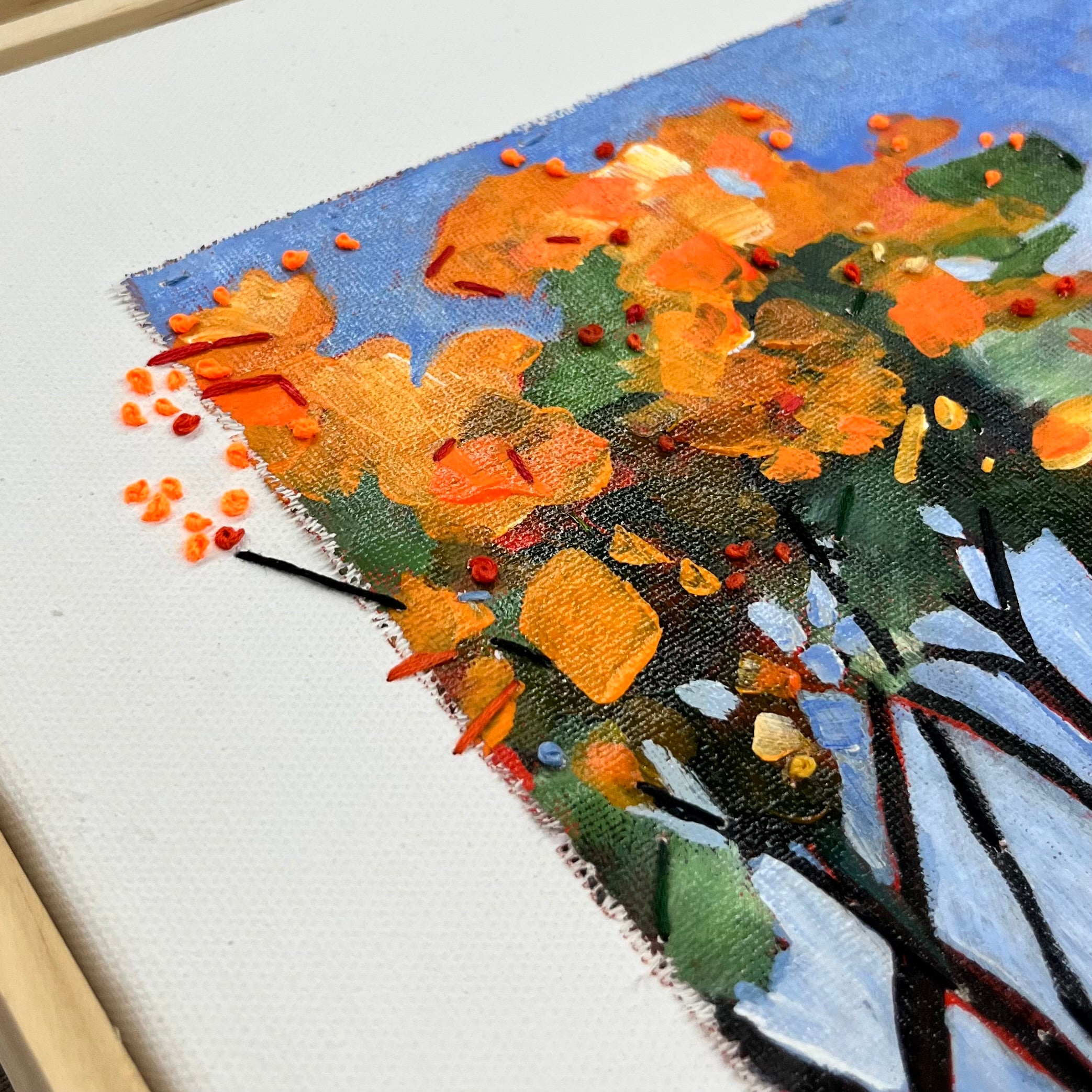 Recently her paintings explore memory and connection: smaller, painted canvases are stitched onto larger fields, with embroidery elements gently spilling beyond their central panels. This process shows how life’s beautiful moments extend their influence into unexpected spaces.