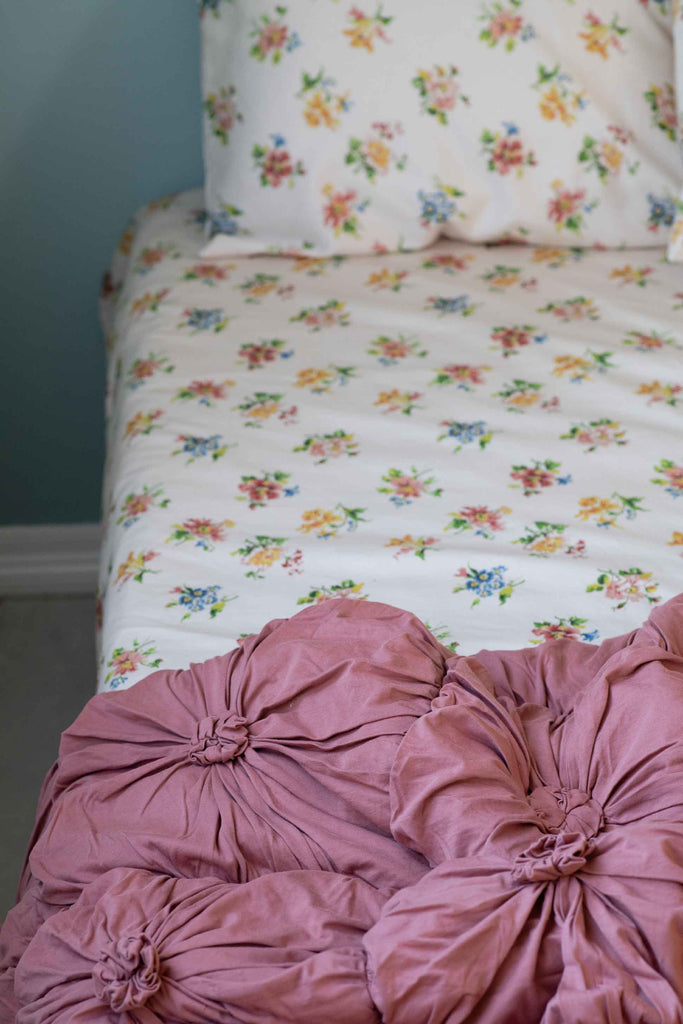 Fresh and happy vintage floral sheet set. Add some colour and prettiness to your bedroom with this soft organic cotton sheet set.