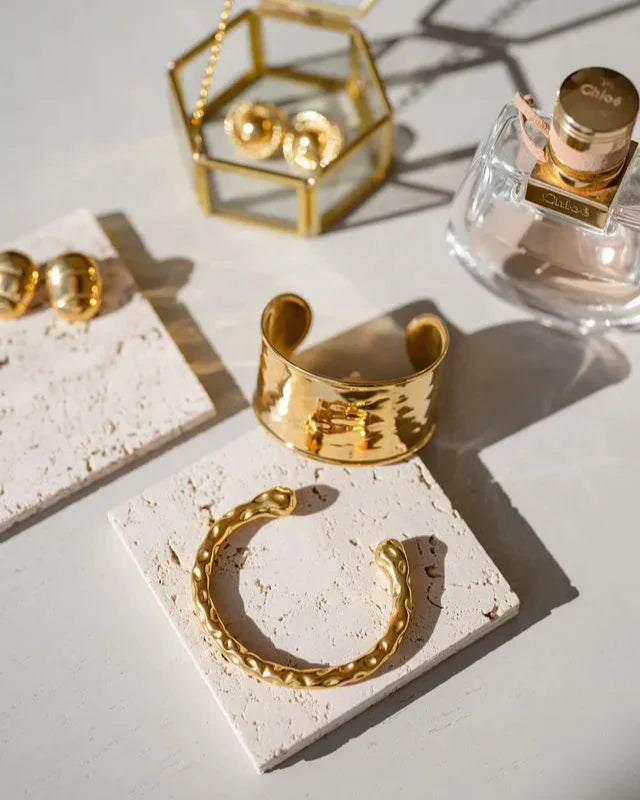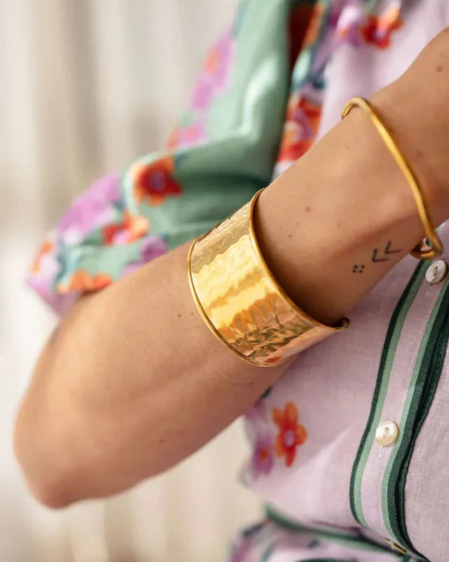 Make a statement with the Inez Bold Gold Cuff Bangle, featuring a striking 3.66cm wide band that commands attention. Designed with a 3.3cm opening, this gold cuff offers an easy, comfortable fit for everyday wear or special occasions. Its bold, modern design pairs perfectly with layered bracelets or worn solo for maximum impact. A must-have statement gold cuff that blends contemporary style with timeless elegance.
