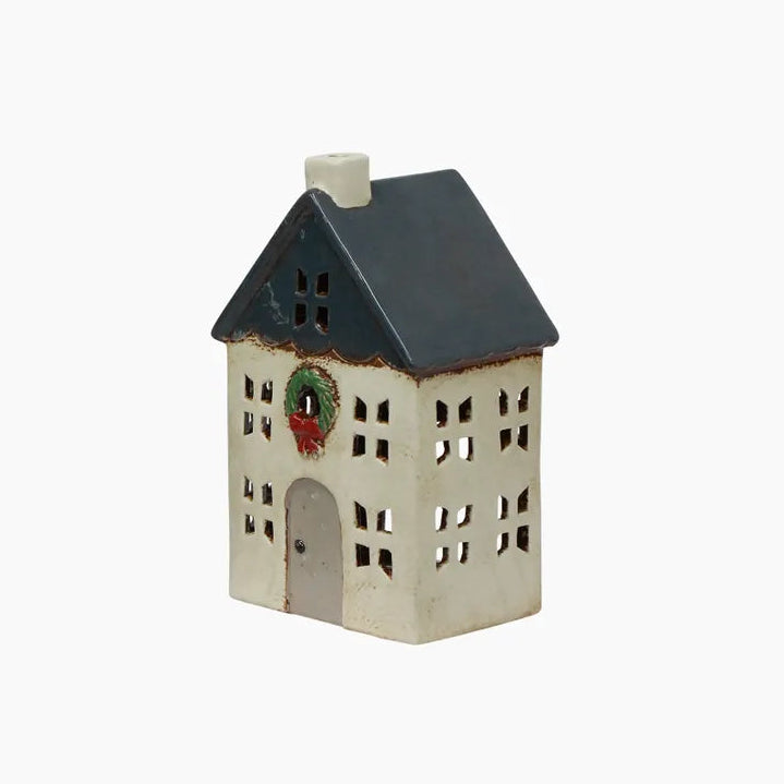 Celebrate the festive season with the Chistmas Tea Light House Blue with Wreath Small. This hand-painted ceramic house, adorned with intricate details, combines festive charm with timeless design; perfect as a standalone piece or collect them all for a glowing holiday display.