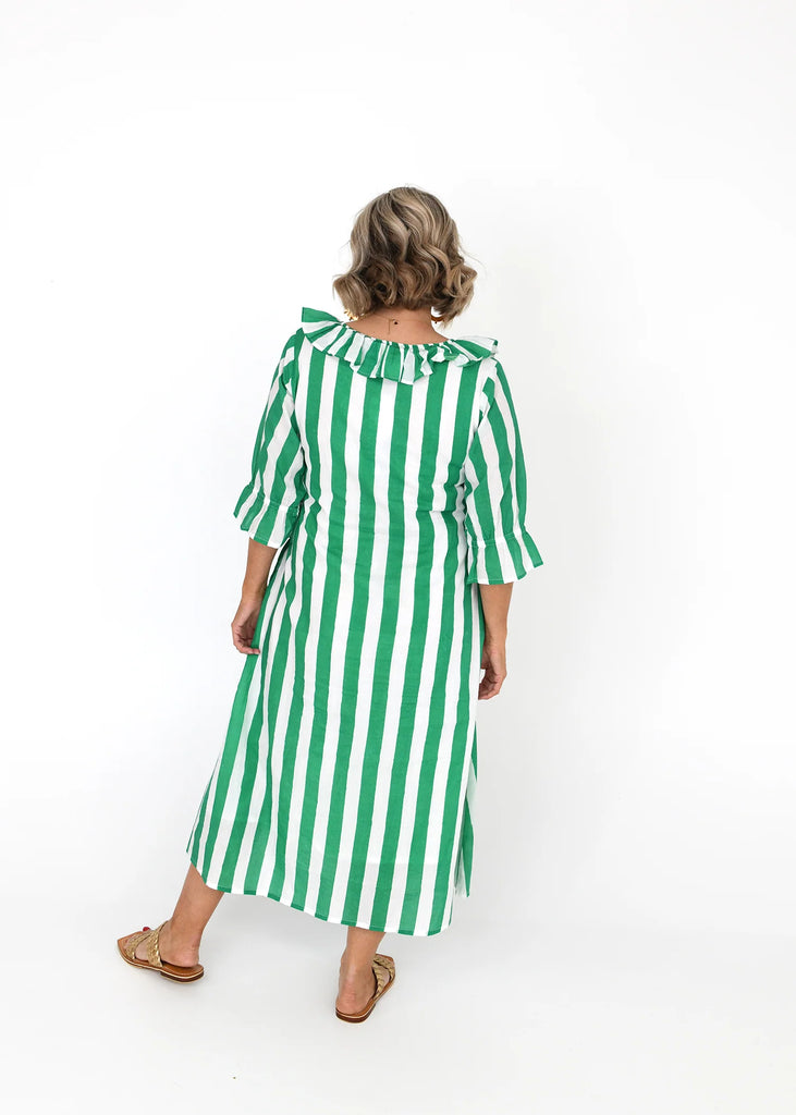 Slip into playful elegance with this green and white vertical stripe midi dress. The relaxed silhouette skims mid‑calf, offering feminine ease without clinging. A softly ruffled V‑neck is accented by contrasting pink tassel ties for a touch of spirited charm.