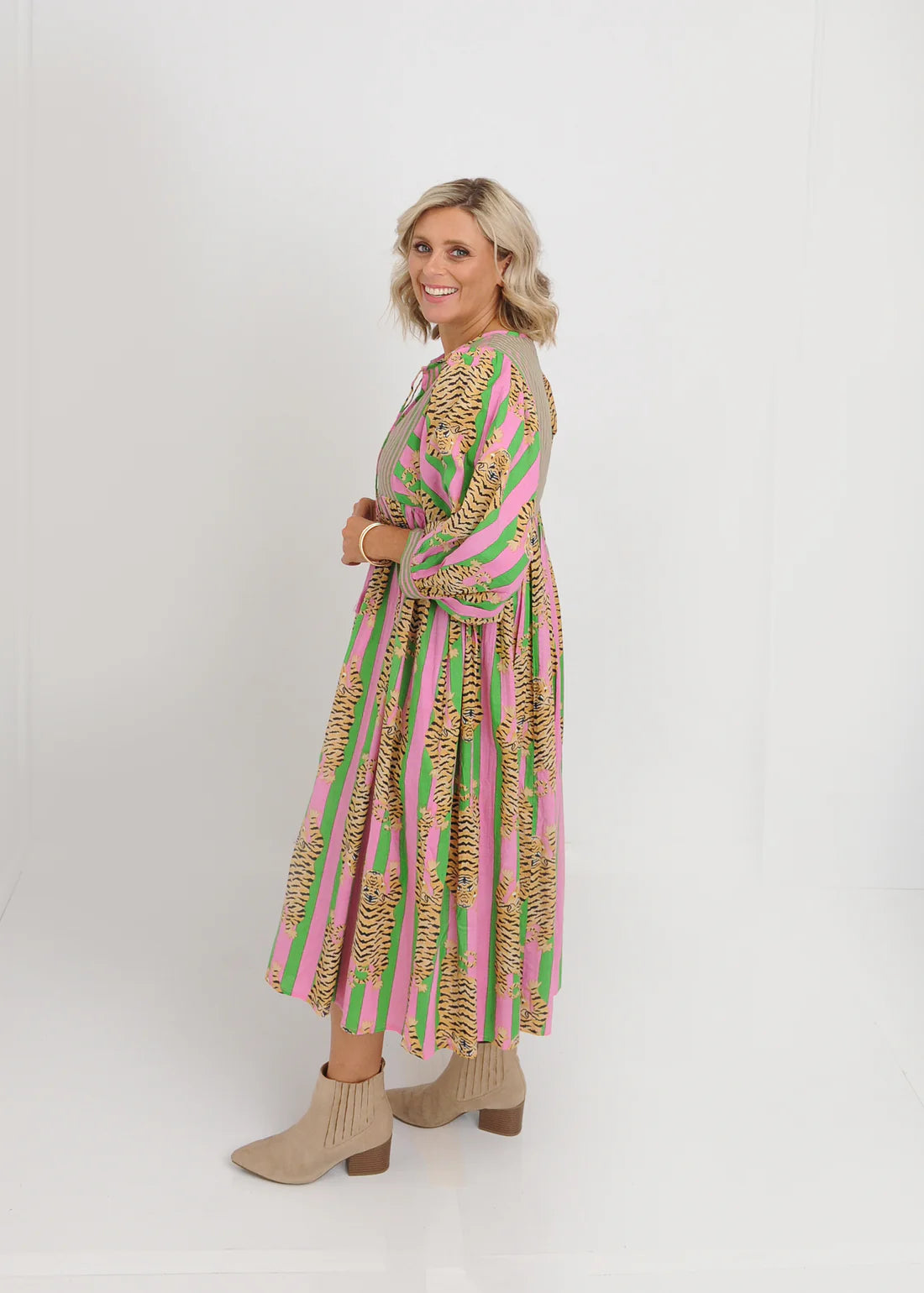 Unleash your wild side with this striking Tiger Print Cotton Dress. Crafted from breathable, lightweight cotton, this dress is perfect for making a bold style statement. The relaxed silhouette offers comfort and ease of movement, while the eye-catching tiger print adds a touch of fierce glamour. Whether you're heading to a casual brunch or an afternoon by the beach, this dress brings effortless chic with a playful edge.