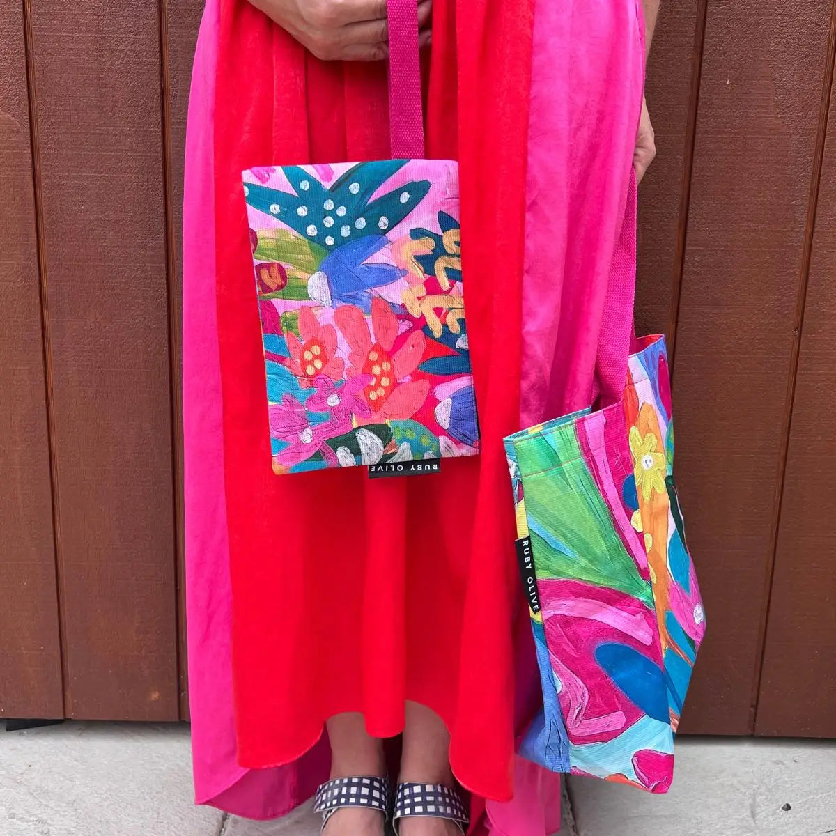 Introducing the Flower Joy Pouch, a handy little pouch made of recycled water bottles! Featuring stunning artwork by an Australian female artist, Steph Chapman, this stylish and sustainable pouch is lined for extra protection and comes with its own wrist strap. Perfect for keys, phone, makeup, bits and bobs. Ready for your next adventure? Measurements: 25cm long x 18.5cm high