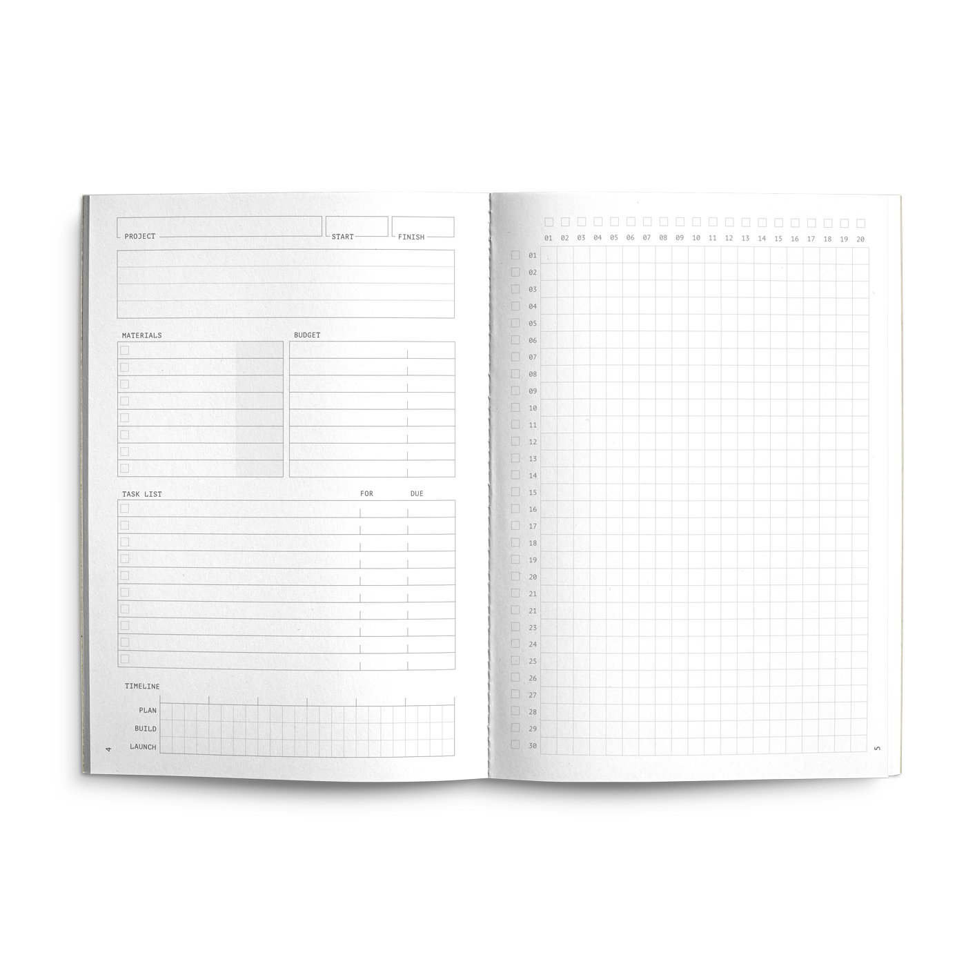 Plan and manage those special projects in your life, from car mods and home renovations, through to work campaigns and inspired crafts. This specialty page format is designed to help you formulate plans and project manage the outcome of DIY projects. Keep track of crucial elements such as budget, materials, tasks and timeline; alongside a specialty graph for plotting out rough blueprints, floorplans or checklists.