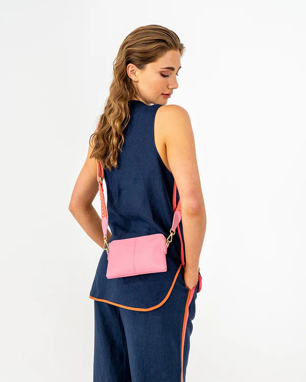 Strap: Detachable cotton crossbody strap in custom chevron stripe, adjustable to 140cm