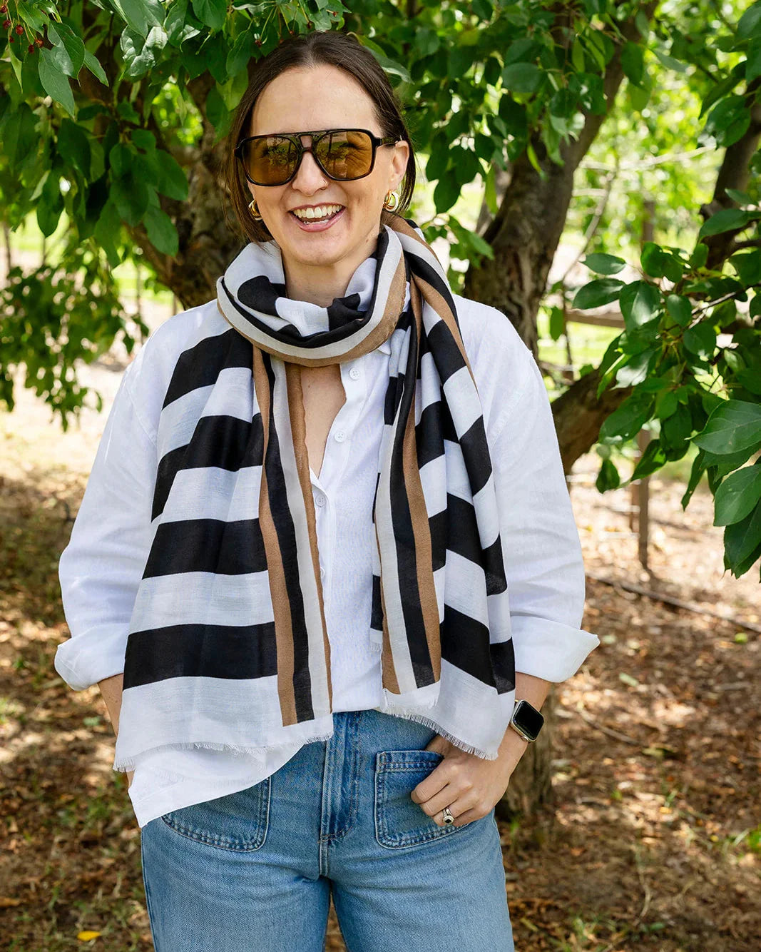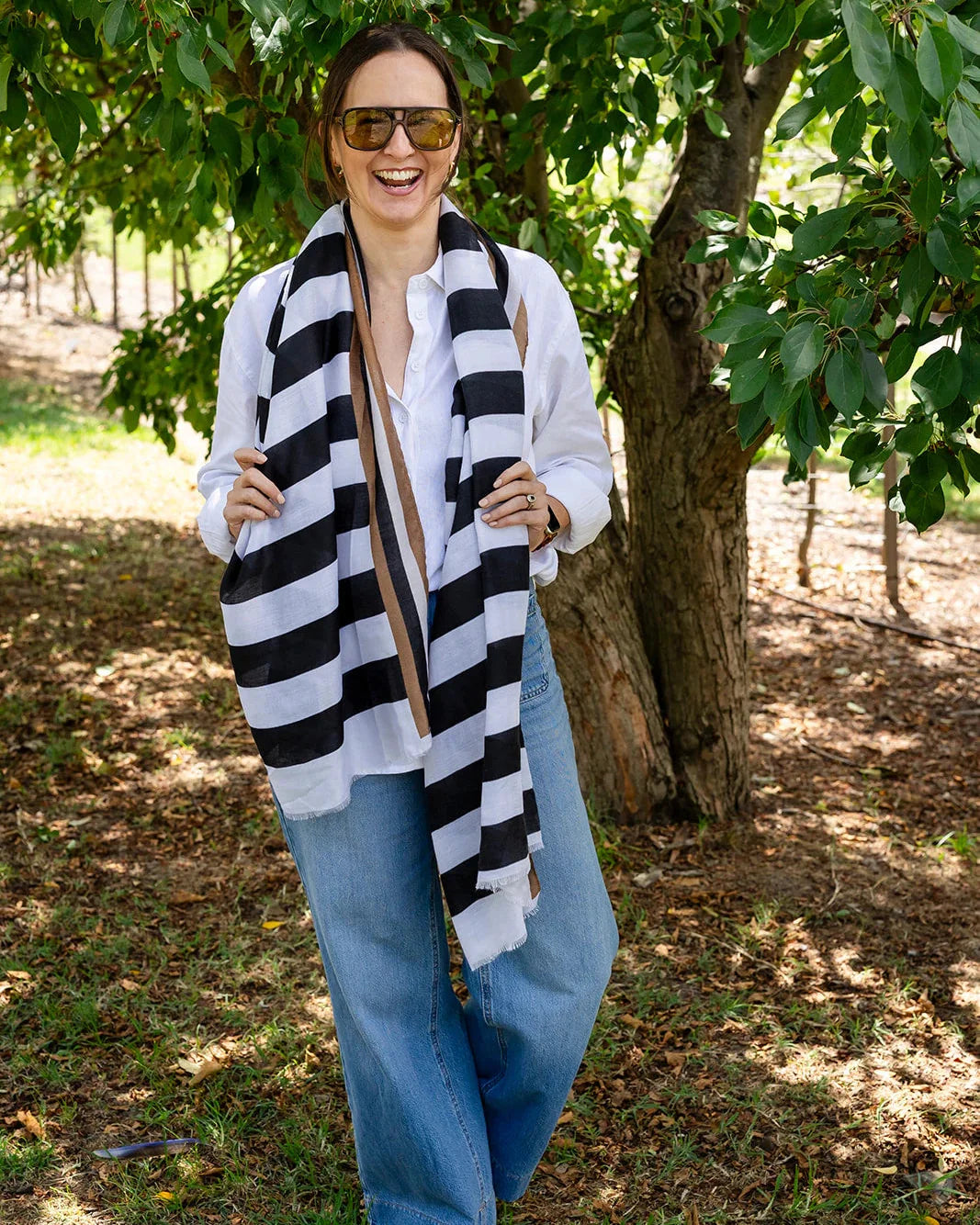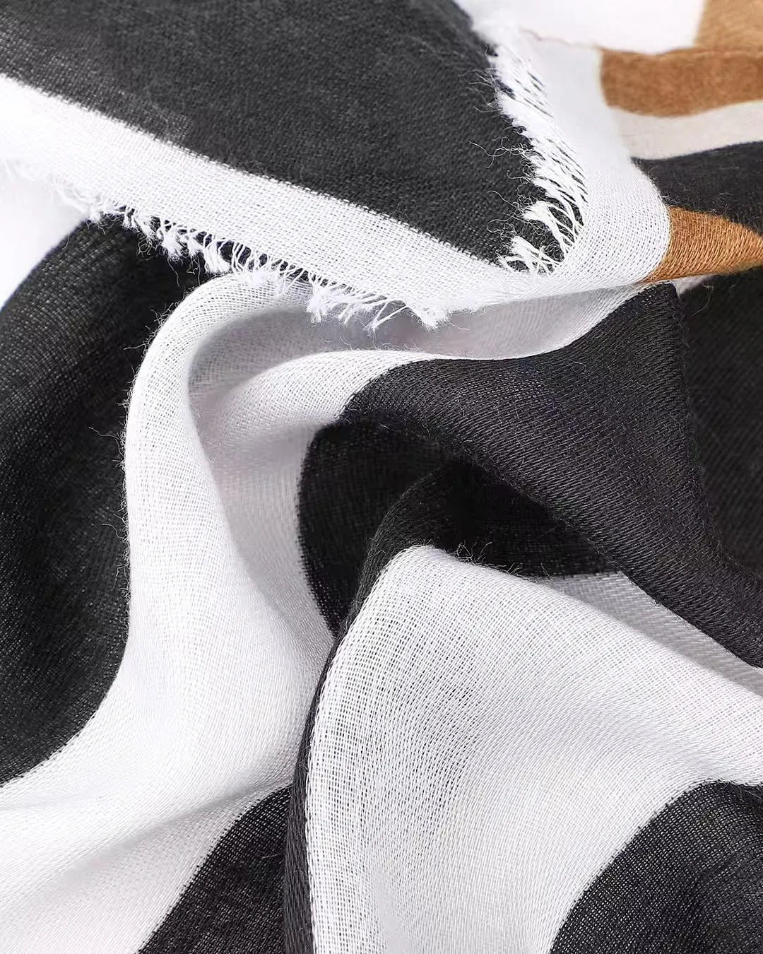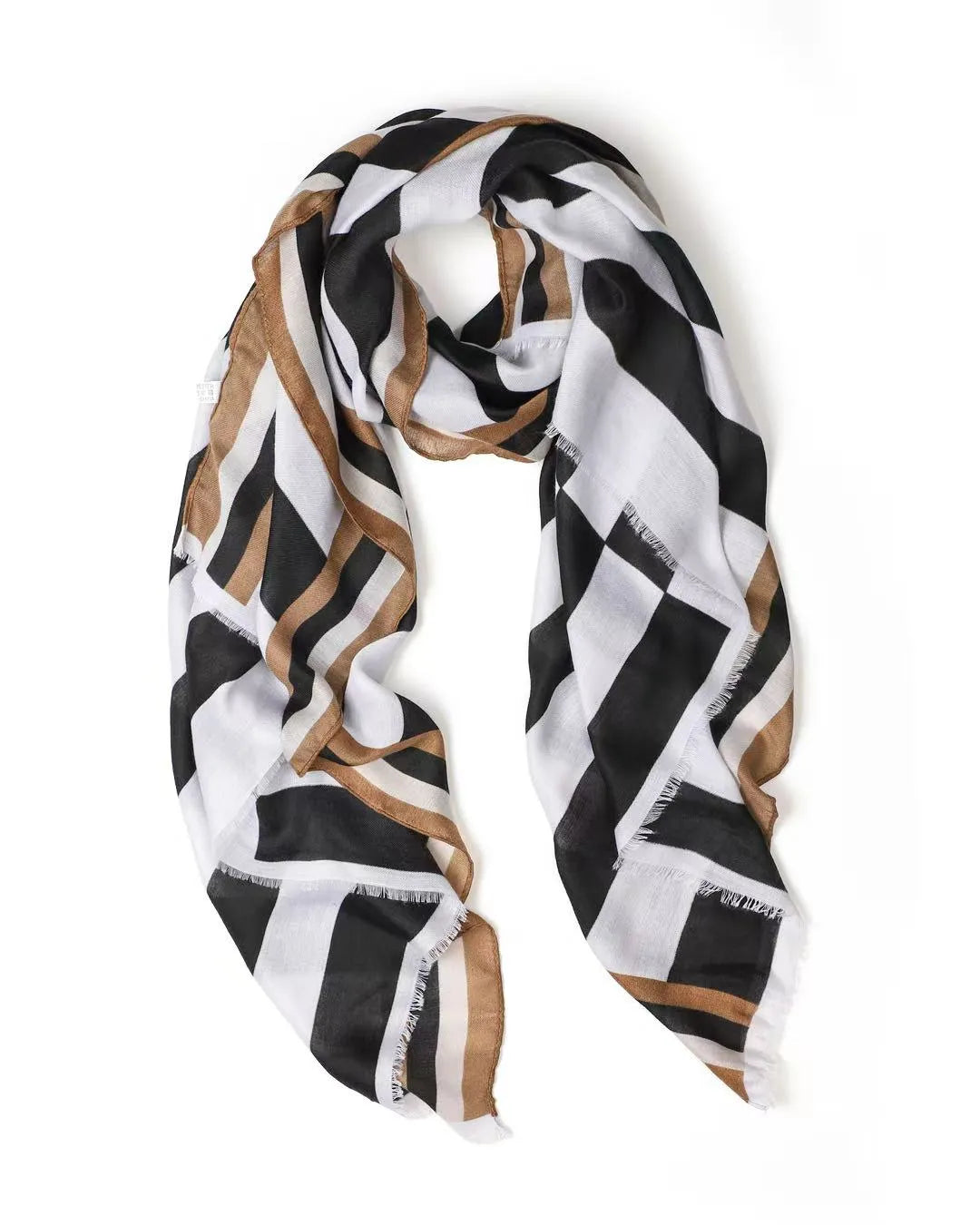Say hello to Flo, a scarf that’s all about colour, confidence and fun. Featuring bold black andwhite stripes, Flo is finished with a classic black and tan striped border for an extra pop of contrast. The slightly frayed edges give it a relaxed, easy-going feel, perfect for everyday wear.