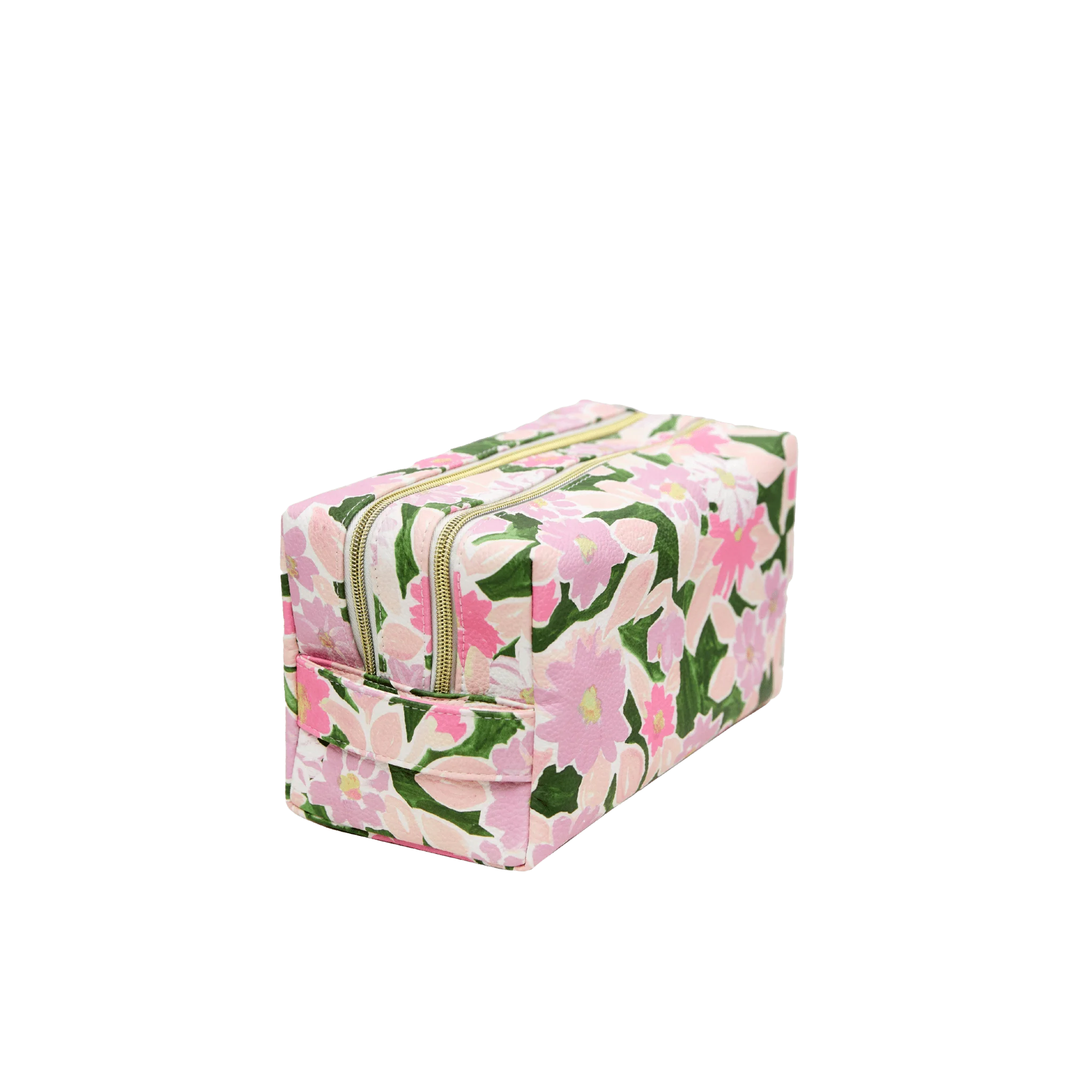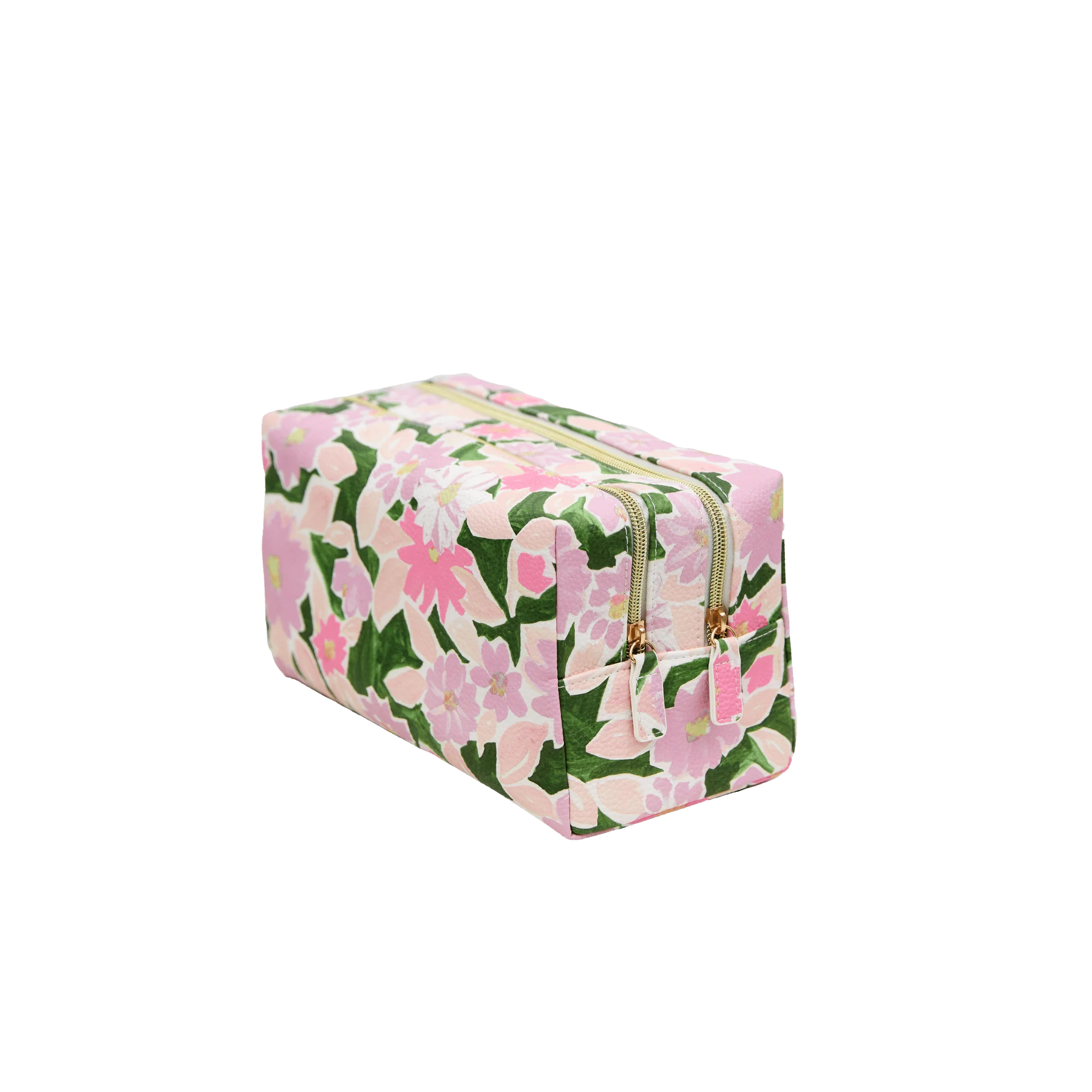 Painterly greens, pinks, and lilacs in a toiletry bag that feels like everyday luxury.