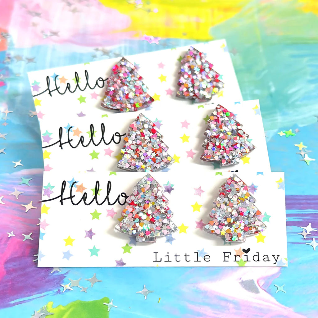 VIBRANT RAINBOW CONFETTI CHRISTMAS TREES : Handmade Resin STUD Earrings