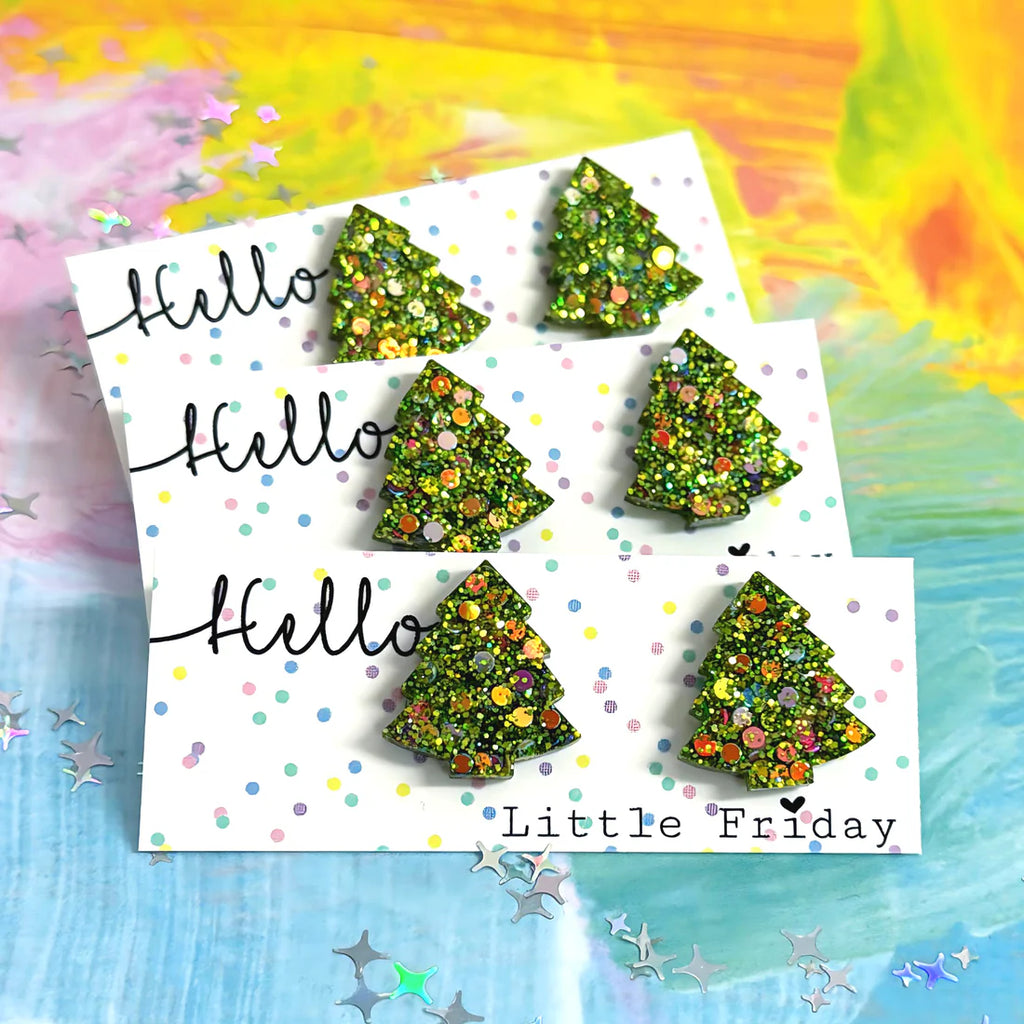 EMERALD STARDUST CHRISTMAS TREES : Handmade Resin STUD Earrings