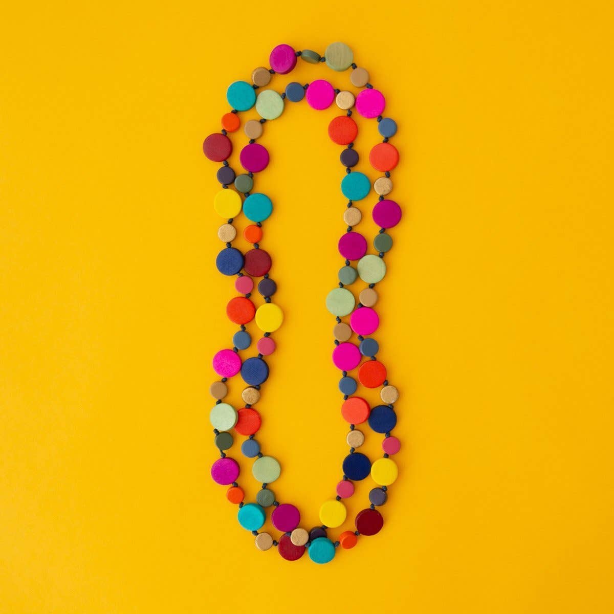 A delicious delight of sustainably sourced wooden beads in alternating colours and sizes! The Smartie Long Single Strand Wood Necklace features a mix of coloured and golden beads. WEAR ME LONG OR DOUBLE ME OVER Strung on high quality cord as a finished single strand (no clasp or metal components). The Smartie Long Necklace is super lightweight and oh so versatile! MEASUREMENTS Neck drop: 59cm approx.