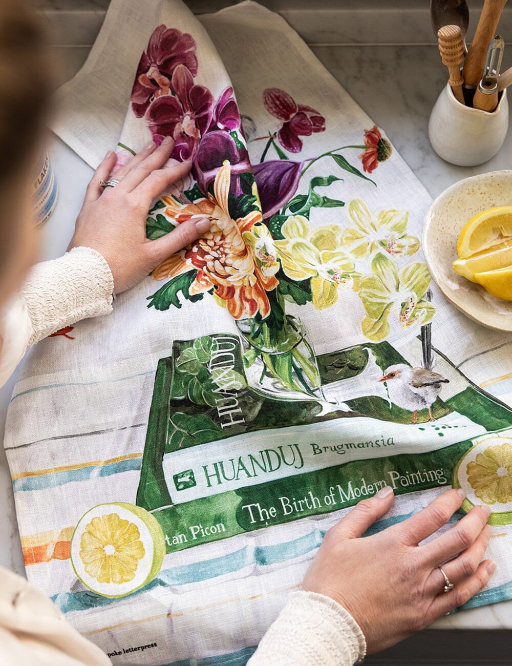 Artwork by Dominika Keller and printed on 100% Linen Tea Towel. Supplied folded with a gold foil printed removable bellyband.