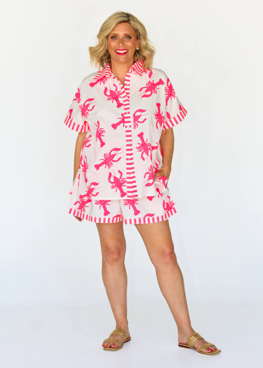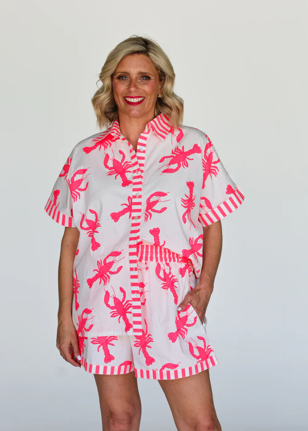Make a statement this summer with our Lobster Twin Set — a must-have for every fashion lover! Crafted from 100% cotton poplin, this lightweight set is designed for comfort and style. The bright neon pink lobsters add a playful pop of colour that’s guaranteed to turn heads.