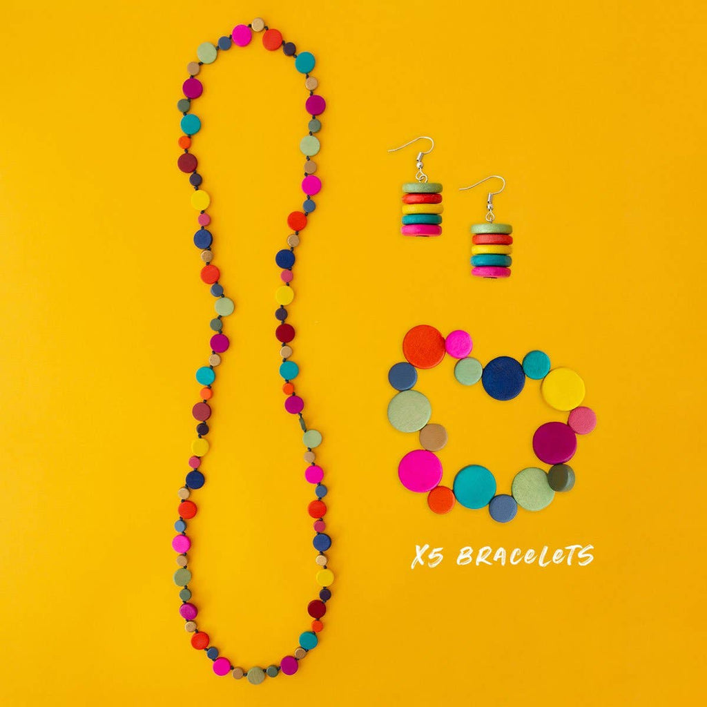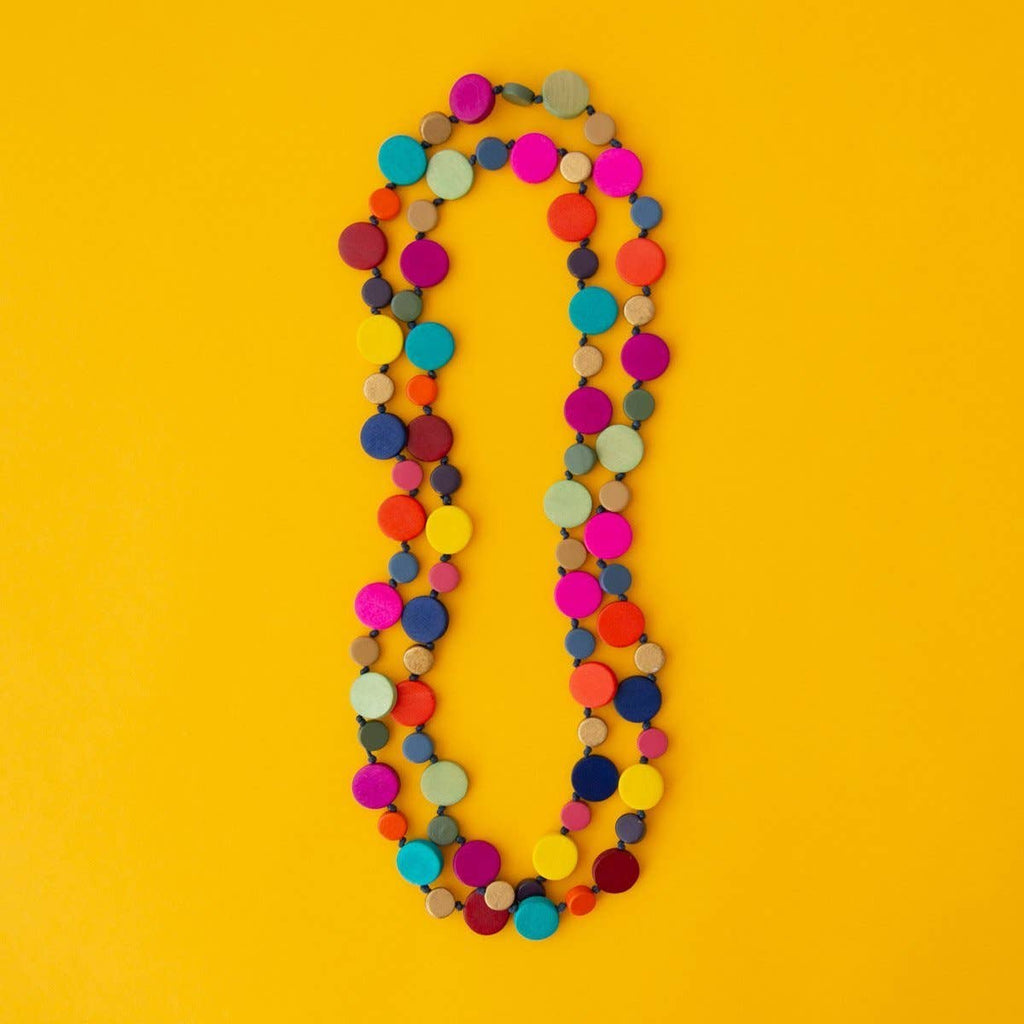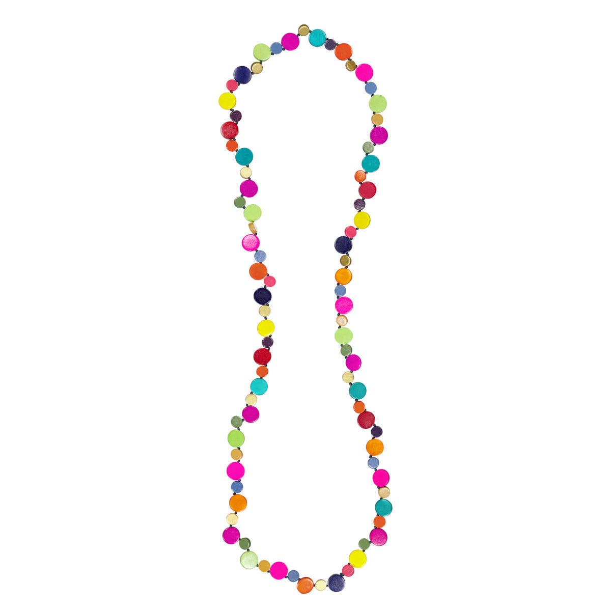 A delicious delight of sustainably sourced wooden beads in alternating colours and sizes! The Smartie Long Single Strand Wood Necklace features a mix of coloured and golden beads. WEAR ME LONG OR DOUBLE ME OVER Strung on high quality cord as a finished single strand (no clasp or metal components). The Smartie Long Necklace is super lightweight and oh so versatile! MEASUREMENTS Neck drop: 59cm approx.