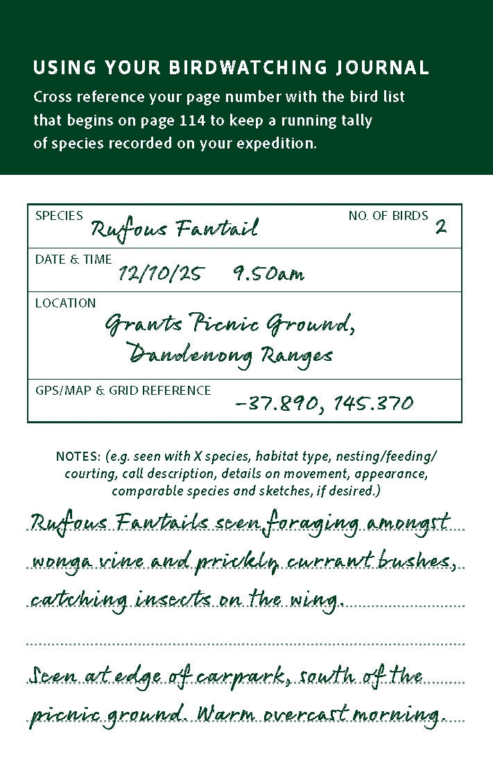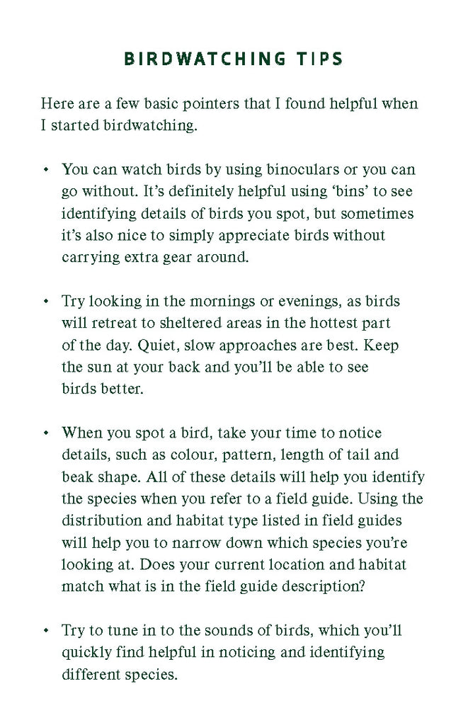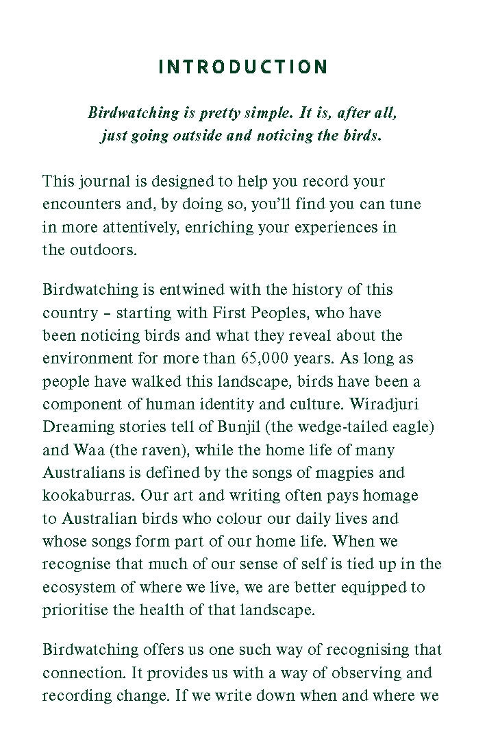 When you use the Birdwatcher's Journal, you will be guided by an easy-to-follow template encouraging attention to detail of each bird’s appearance and behaviours. It also includes a comprehensive list of Australian bird species, along with descriptions and anecdotes throughout from author, artist and bird nerd Georgia Angus (100 Australian Birds, Birds with Personality).