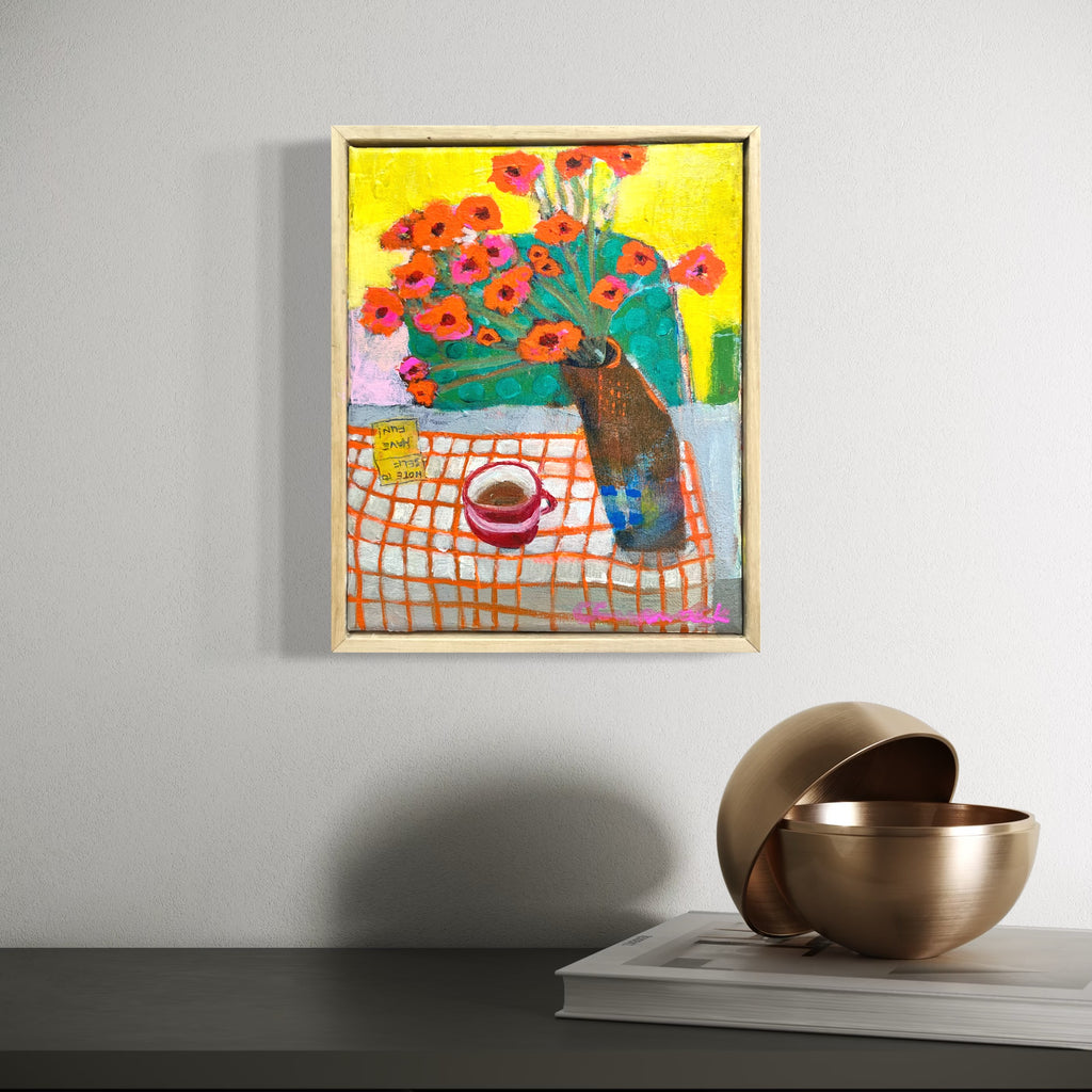 Mixed media on stretched canvas, framed in Tasmanian Oak. Ready to Hang.