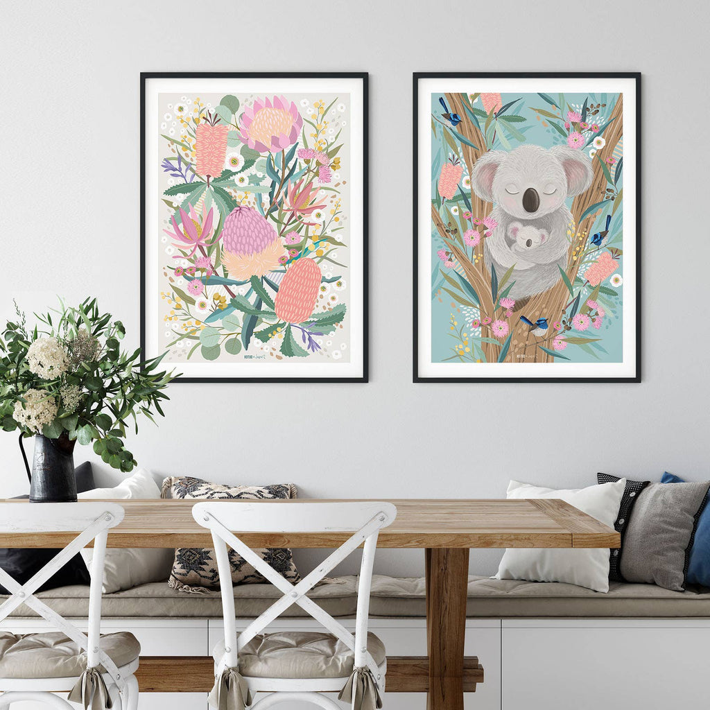 Designed by Milly and Mae using a wide array of greens, teals and pinks, a Koala holds tight to her baby. Sitting high in the trees they have not a care in the world, just enjoying the sanctuary of the Australian bush