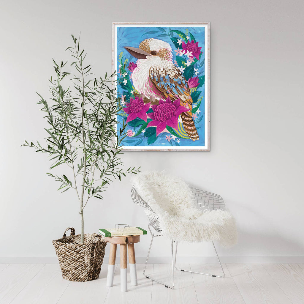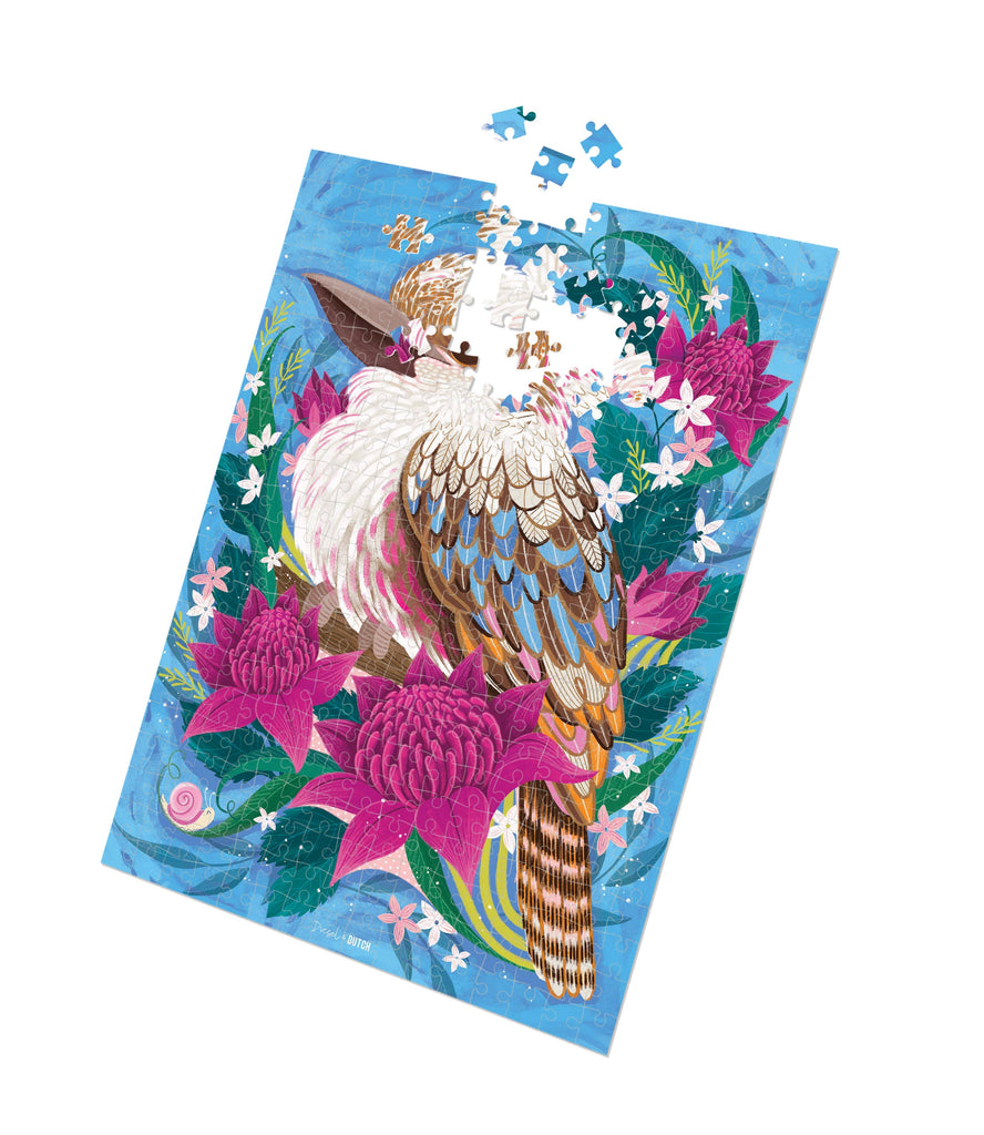 This vibrant jigsaw puzzle design showcases a beautifully detailed kookaburra perched among lush Australian flora. With intricate feather patterns in earthy tones and pops of blue, it's surrounded by bold magenta waratah flowers and delicate white blossoms. A playful pink snail adds charm to the textured sky-blue background, creating a striking and whimsical composition.
