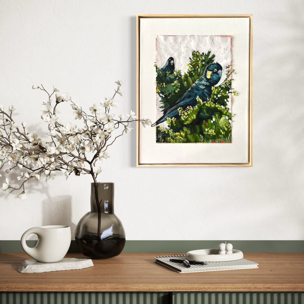 Mixed-media painting - acrylic, charcoal, inks, pen and embroidery thread. Framed & ready to hang.