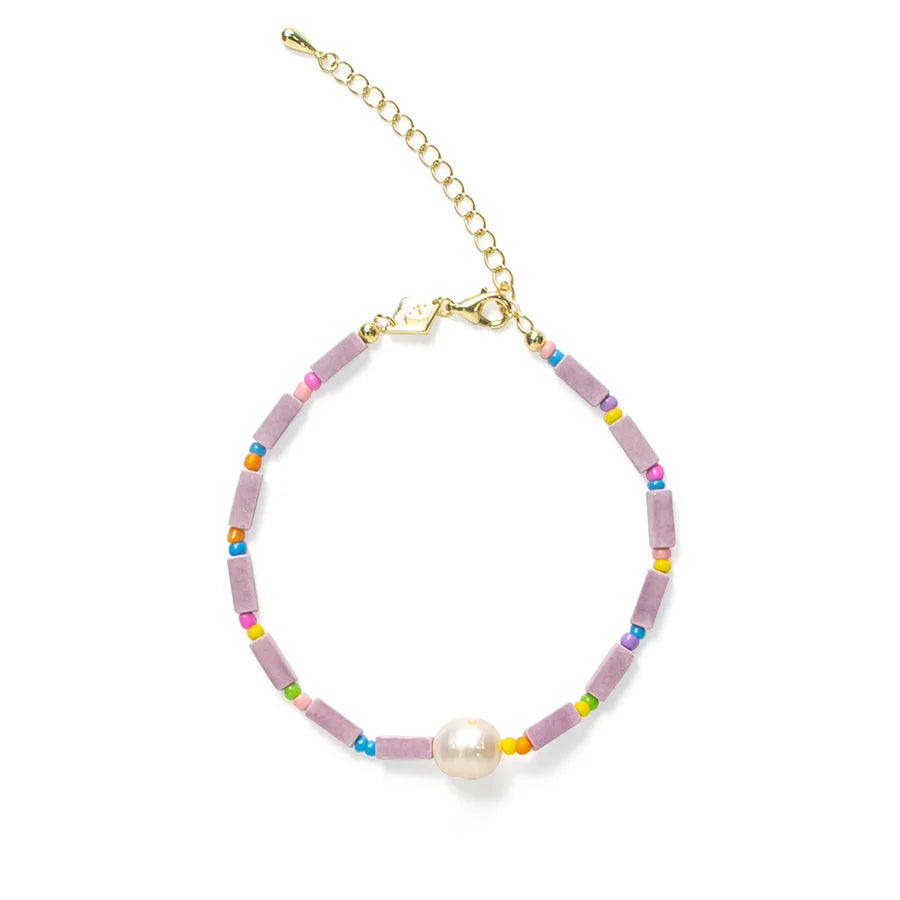 - One genuine Freshwater pearl, spaced with polished stone beads with glass pops of colour (no plastic) and gold vermeil (925 silver base metal with a 24 karat gold coating, not brass!) clasp and extender.