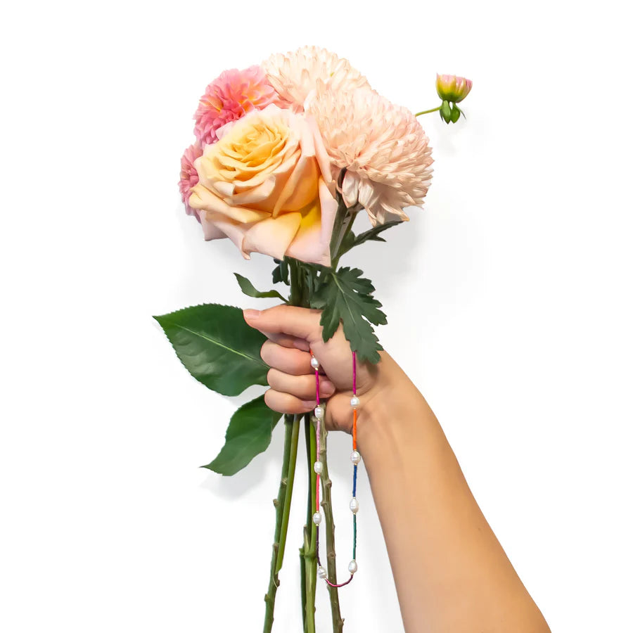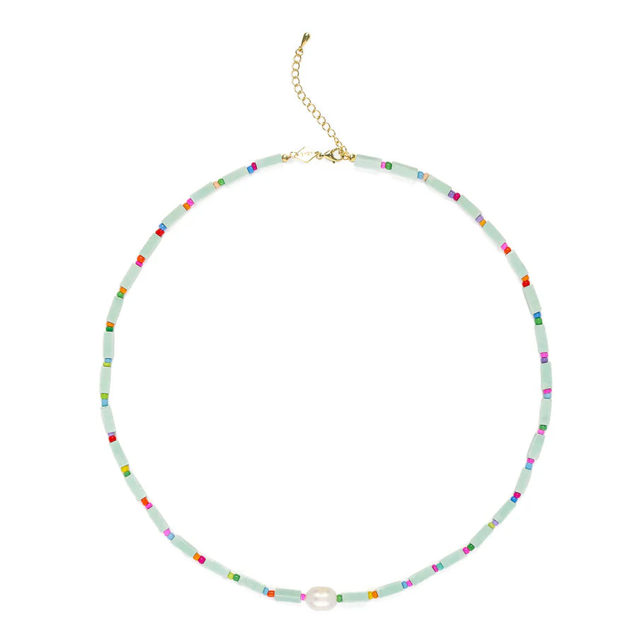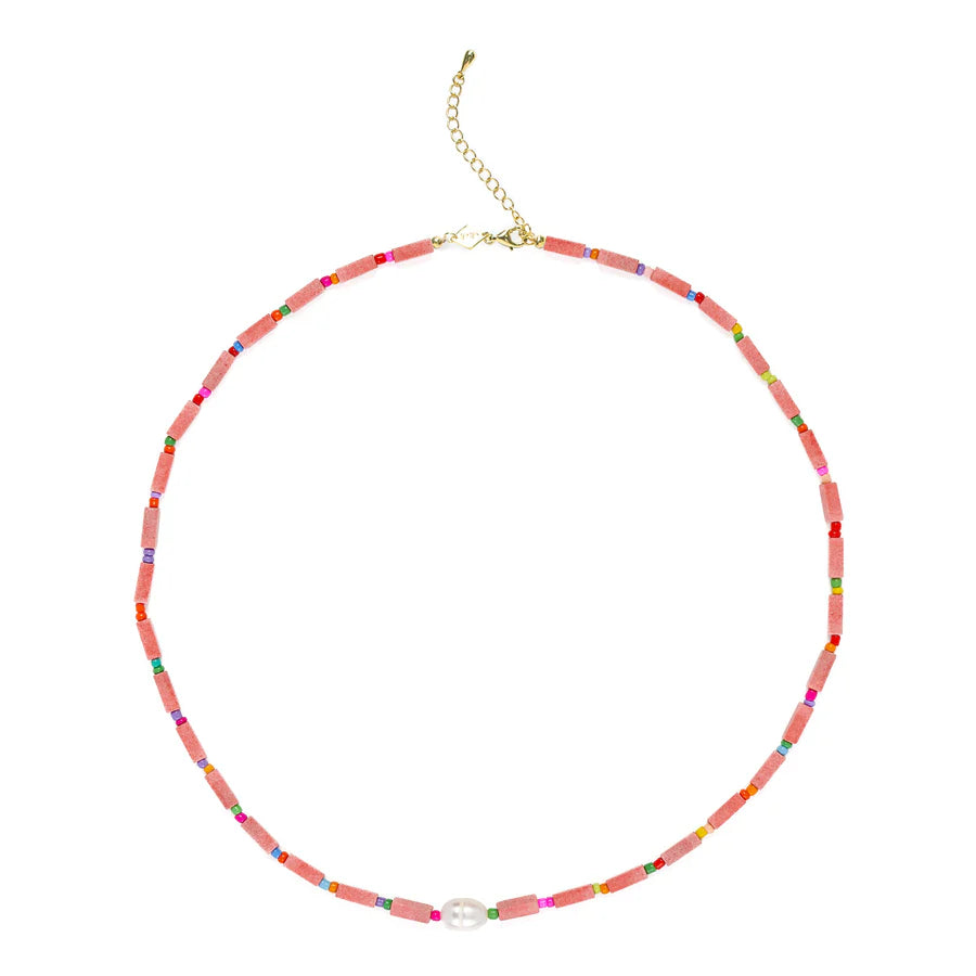- One Freshwater pearl, spaced with polished stone beads (no plastic) and gold vermeil (925 silver base metal with a 24 karat gold coating) clasp and extender.