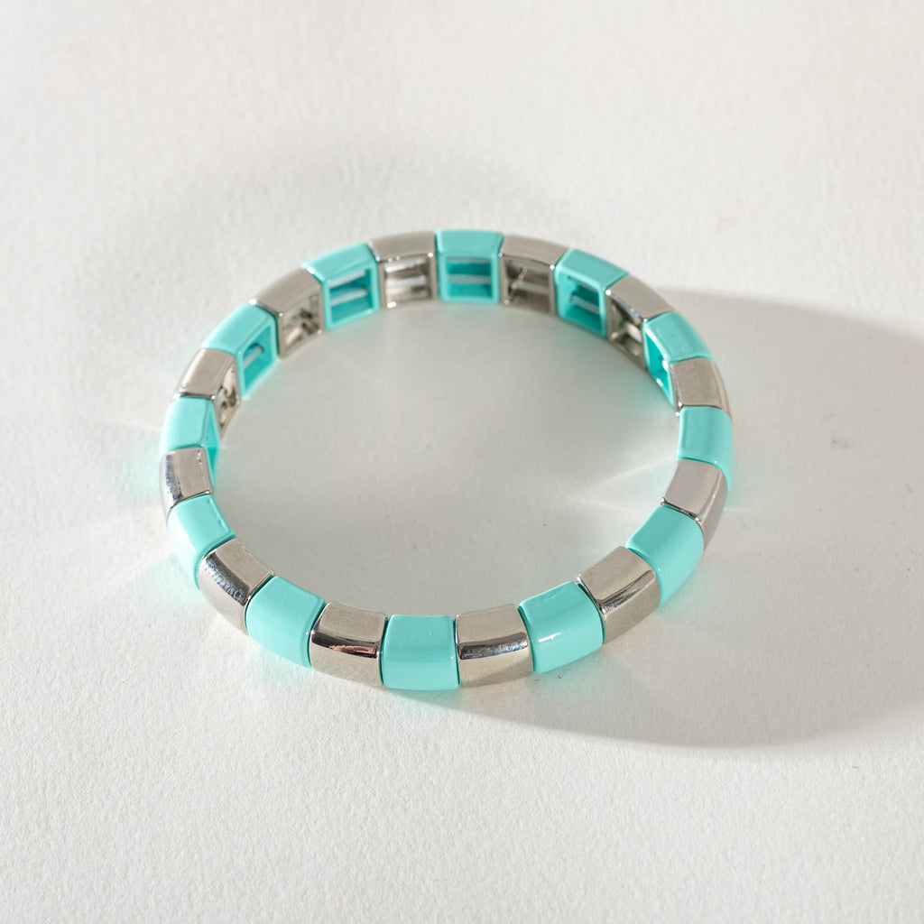 Silver Enamel Stacking Bracelet - Stripe Rounded Aqua /Silver