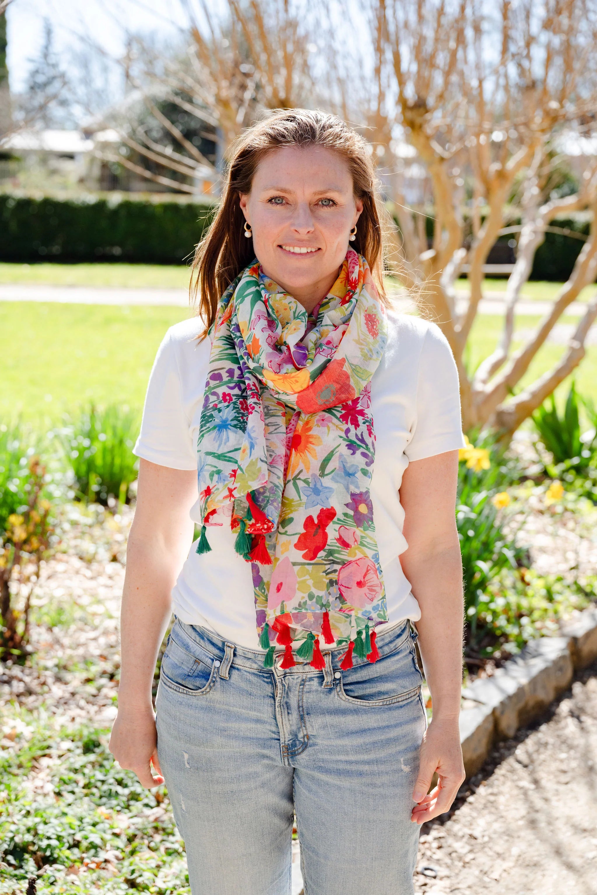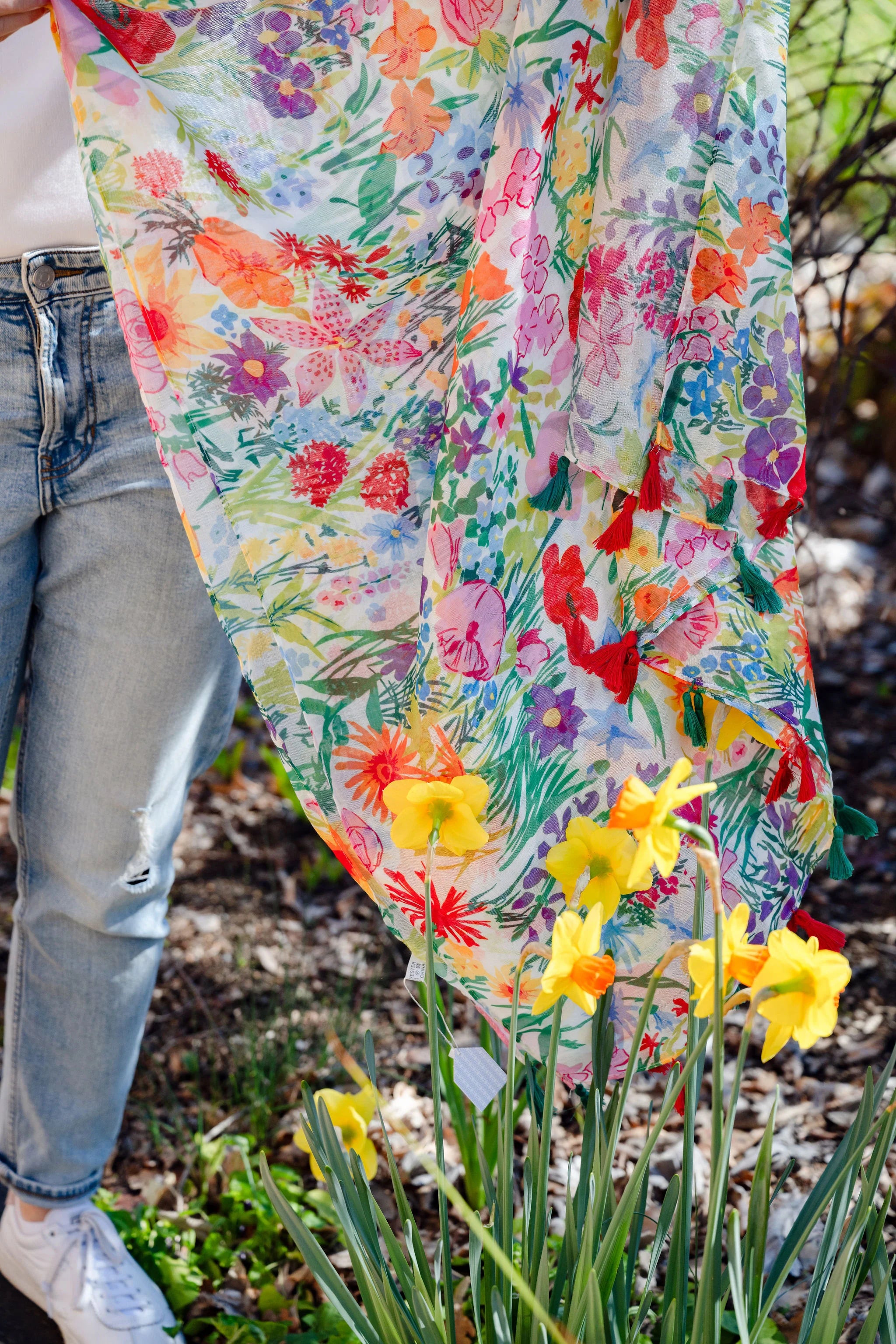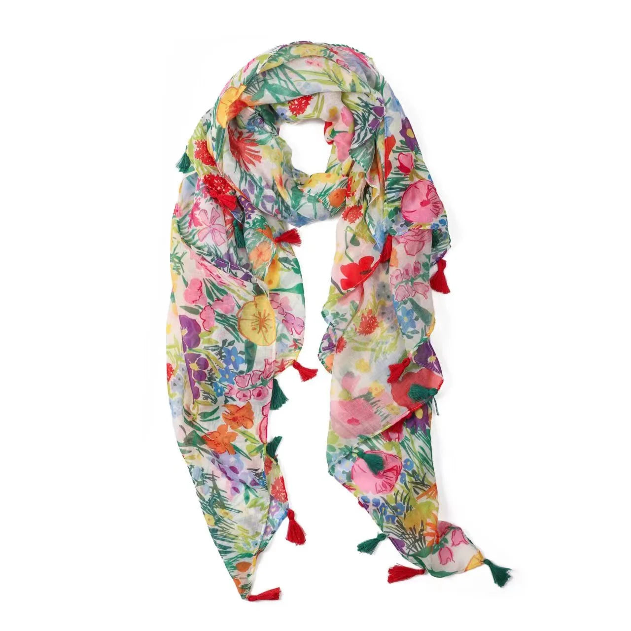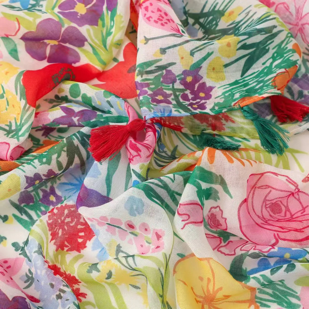 Introducing April, the scarf that’s as fresh and vibrant as a spring garden! This lightweight beauty is adorned with a delightful floral design bursting in bright colours—think pink, green, purple, yellow, and red—all on a crisp white background. And just when you thought it couldn't get any better, April finishes off with playful red and green tassels that add a touch of whimsy to this masterpiece. Whether you're out for a stroll or just want to add a pop of colour to your day, April has got you covered (literally!).