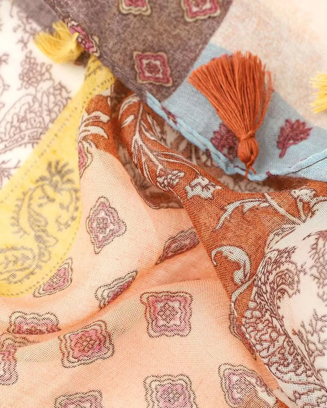 Say hello to Tara, a beautiful lightweight scarf with an effortless bohemian feel. Designed in a patchwork style, Tara blends warm earthy browns with pops of yellow, blue and soft pink for a look that’s relaxed yet full of interest. Finished with yellow and brown tassels for that extra boho touch, this scarf is perfect for adding colour, texture and personality to your everyday outfits. Easy to wear, easy to love, and perfect for year-round styling.