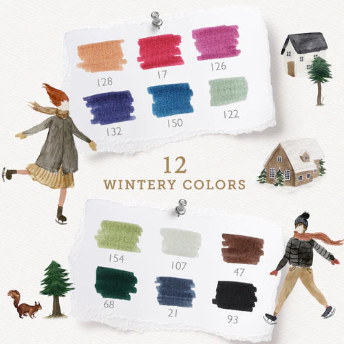 - Alpine winter colors: dark and moody - 12 pens with 4 journal sticker sheets in matching colorways