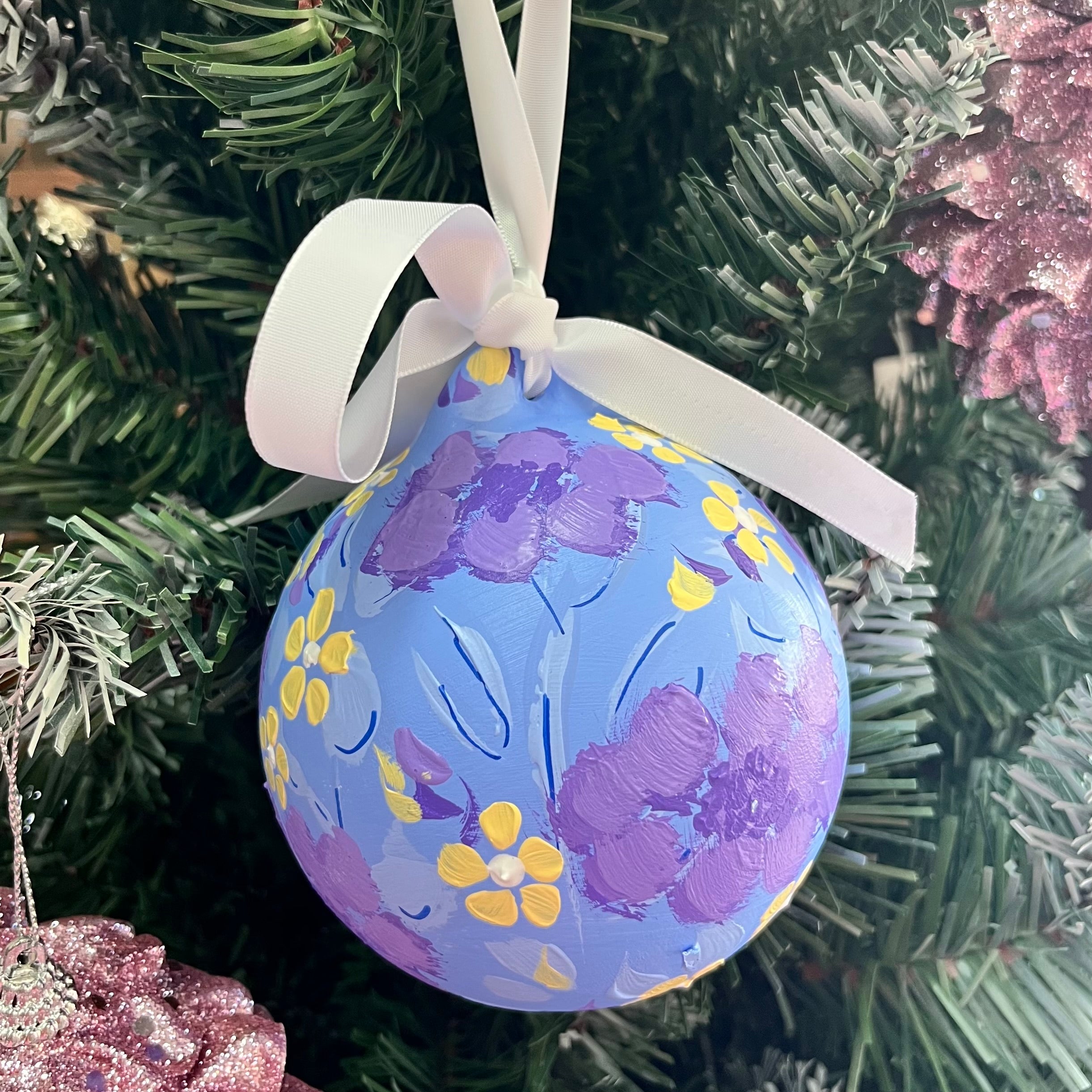Acrylic on Ceramic with ribbon. Original hand painted florals.