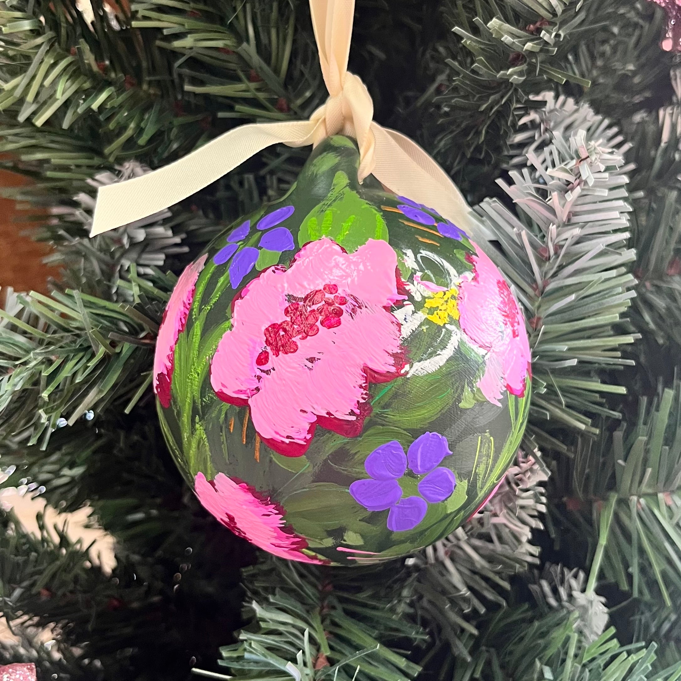 Acrylic on Ceramic with ribbon. Original hand painted florals.