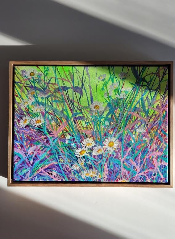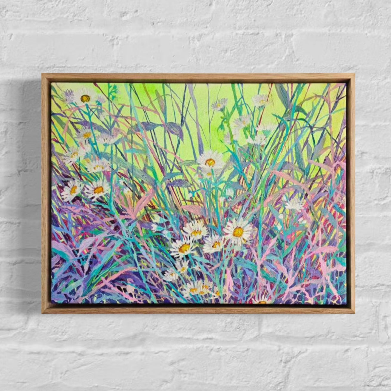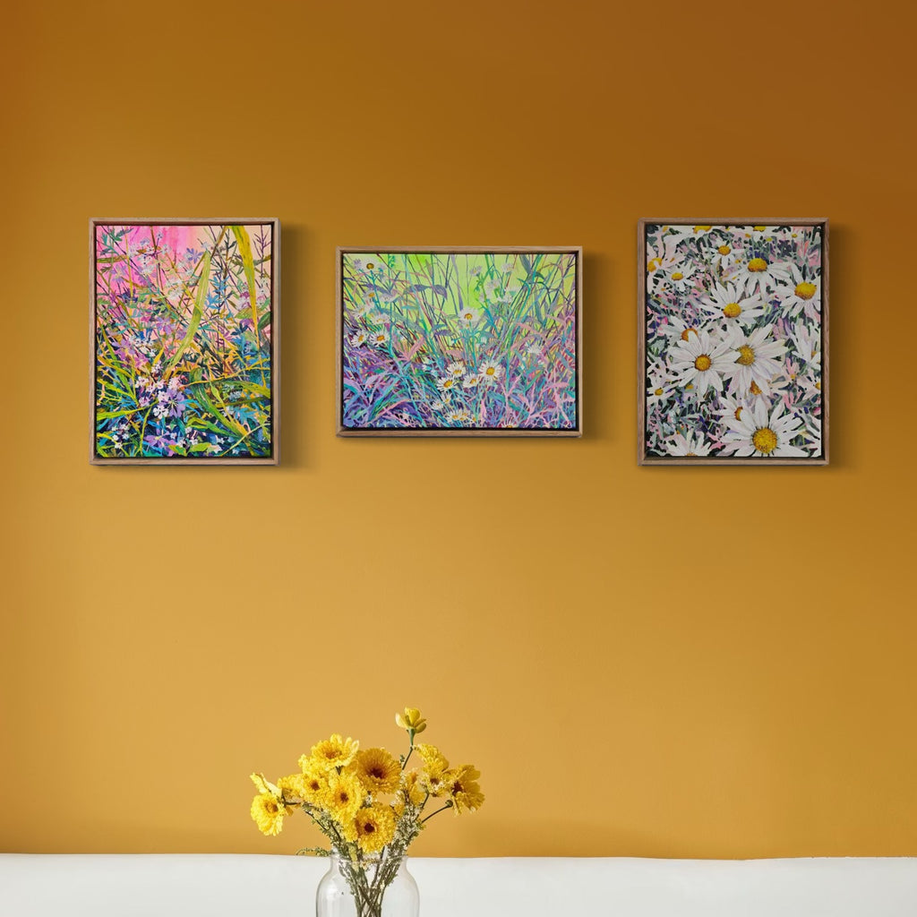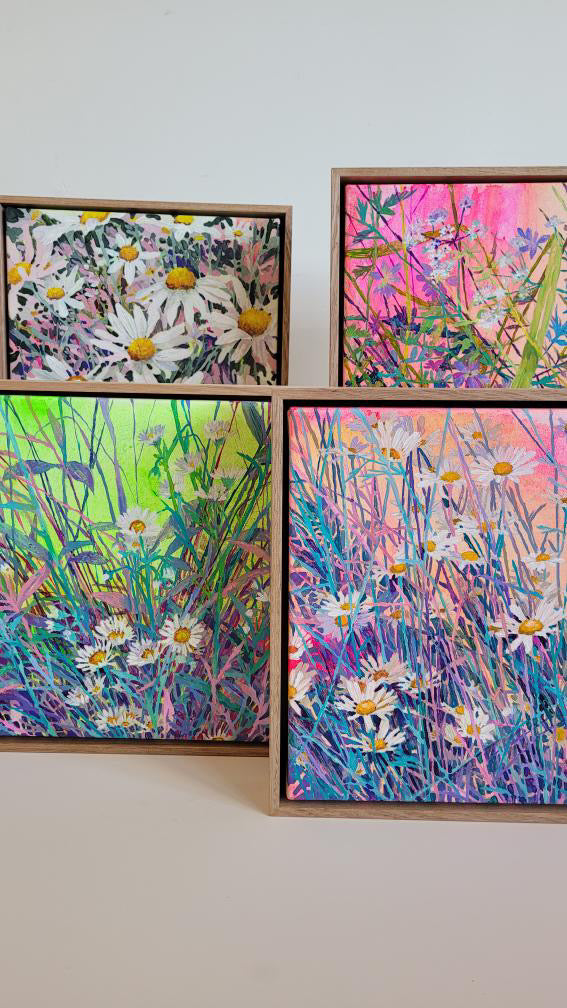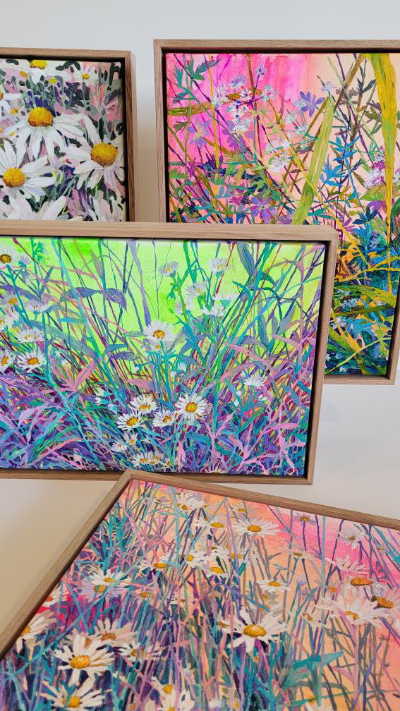 These four paintings capture wild daisies, tangled weeds, and resilient blooms in their natural form. Bursts of neon breathe energy into each piece, turning the ordinary into something luminous and alive.