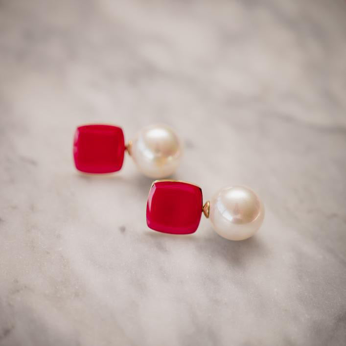Enamel squares adorned with a glass pearls. Gold plated posts.