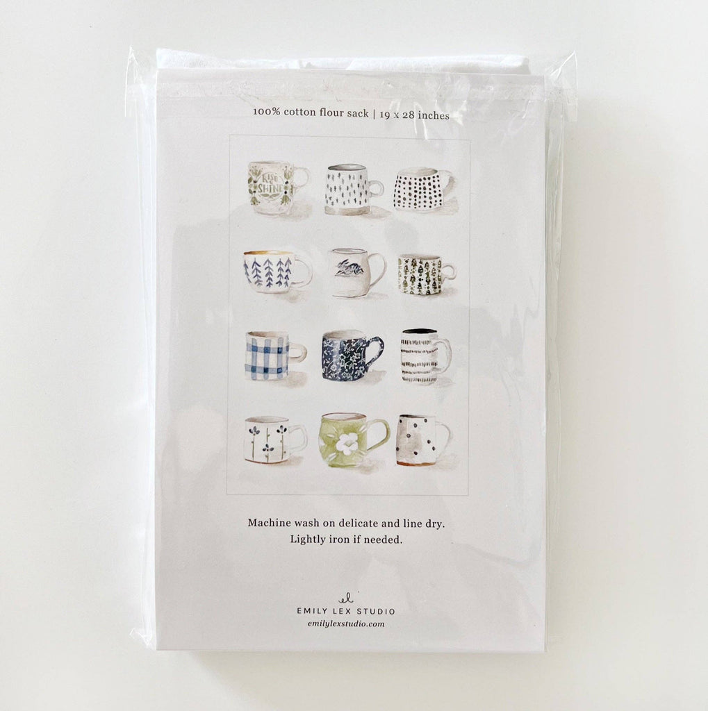 Add a touch of delight to your kitchen with this 100% cotton tea towel. Cheerful mugs cover the towel making it perfect for gifting, washing up, lining a basket, or displaying in your kitchen for a splash of color. Details: - 100% cotton flour sack tea towel - 19" x 28" - Loop for hanging - Machine wash and dry - Original watercolor artwork by Emily Lex