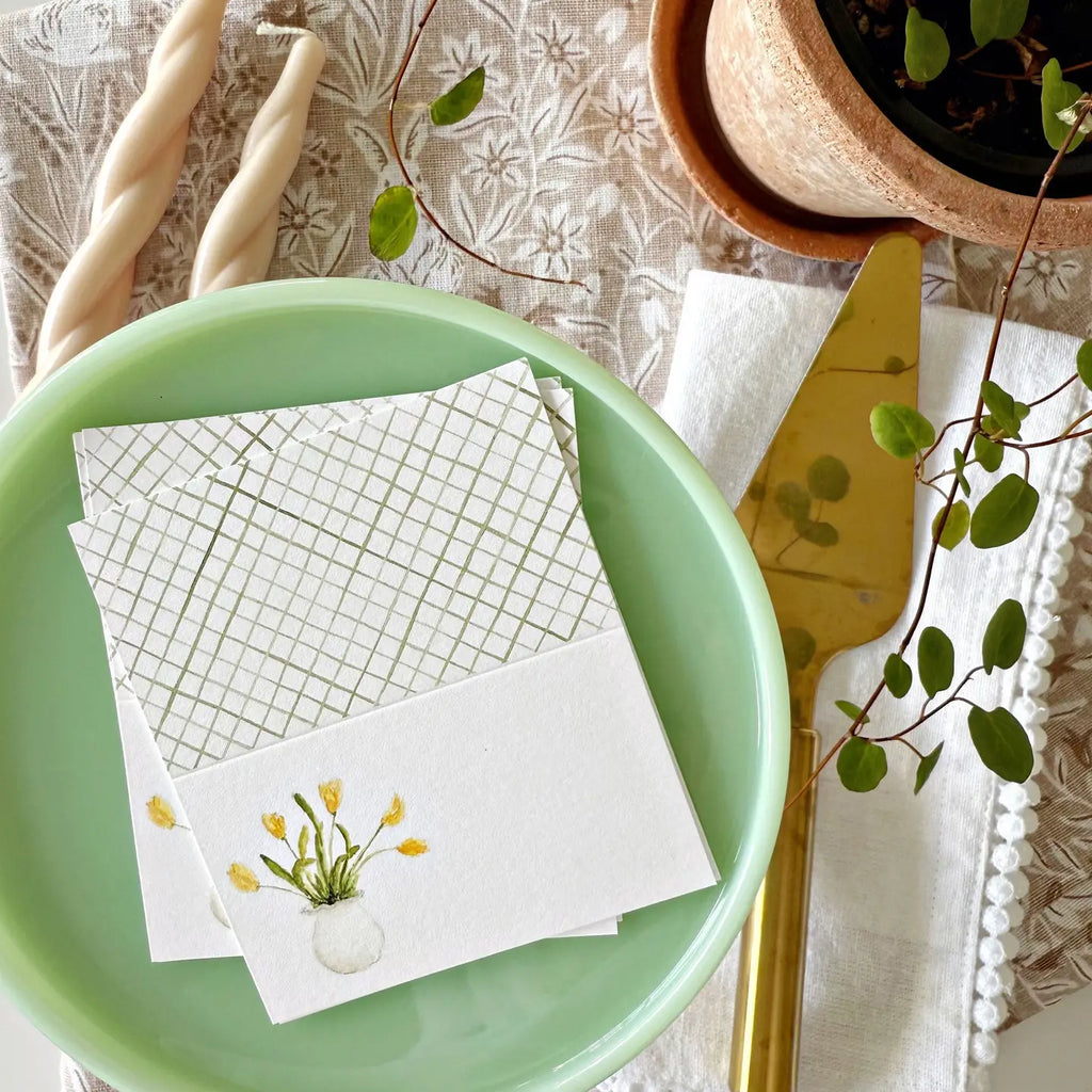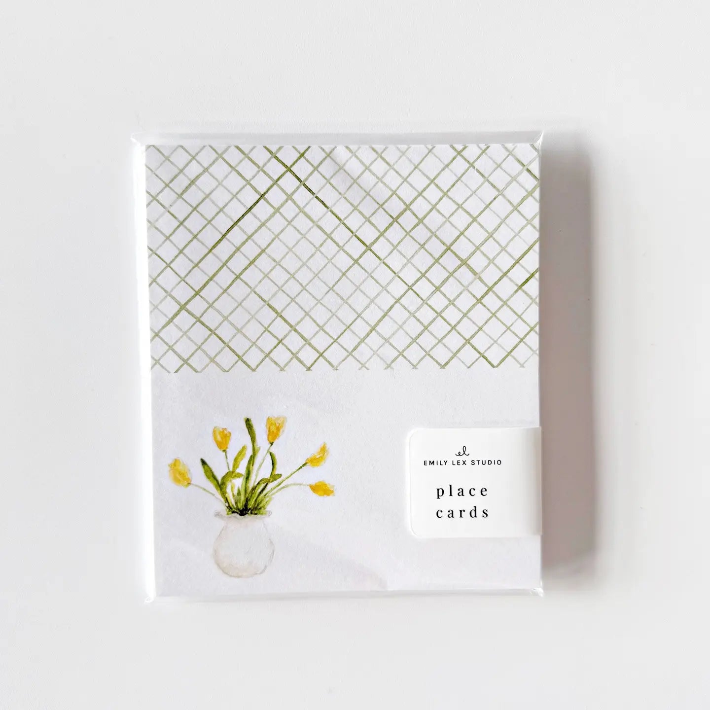 Set a cheerful table for your parties, luncheons, dinners, and showers with charming place cards for each guest. Details: - set of eight place cards - blank space for name to be written - 2" x 3.5" when folded - Printed on 120lb superfine paper - Original watercolor artwork by Emily Lex
