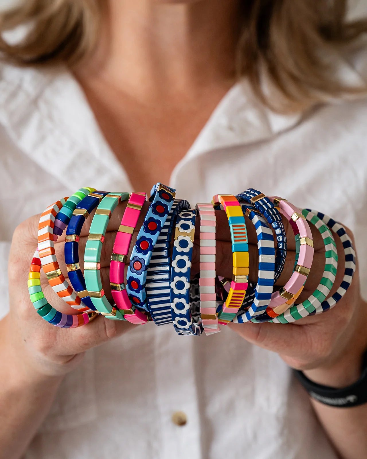 Discover our elasticated enamel beaded bracelets in all the colours of the rainbow!