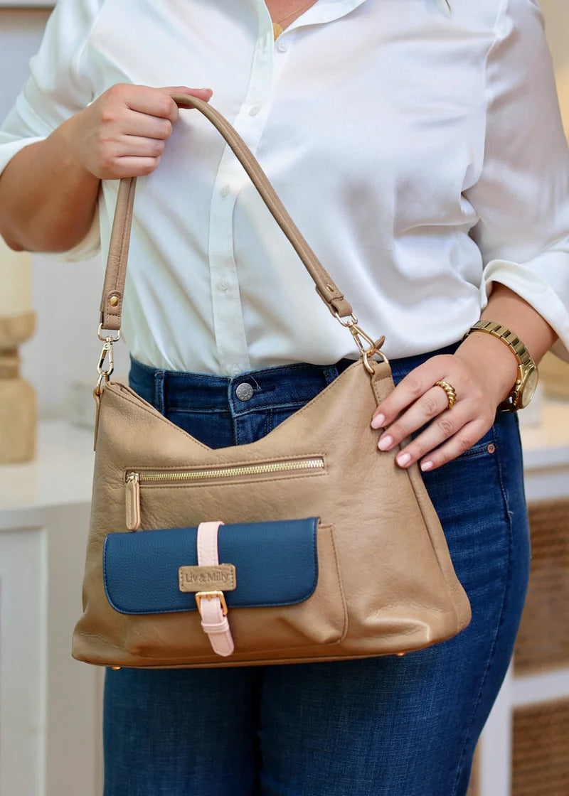 Convenience, class and versatility are exactly what GABRIEL represents. Designed with a practical front pocket, this bag is available in Navy, Nutshell and Caramel, offering timeless style and functionality. GABRIEL also features the flexibility of both a sturdy shoulder handle and a long crossbody strap.