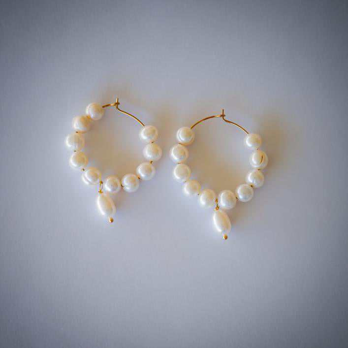 Get ready to sparkle with these fun gold-plated hoop earrings! Measuring 3.5cm by 4.5cm, they feature 10 chic pearls and a playful pearl dangle. Perfect for adding a touch of sophistication to any look while keeping things lively and lighthearted!