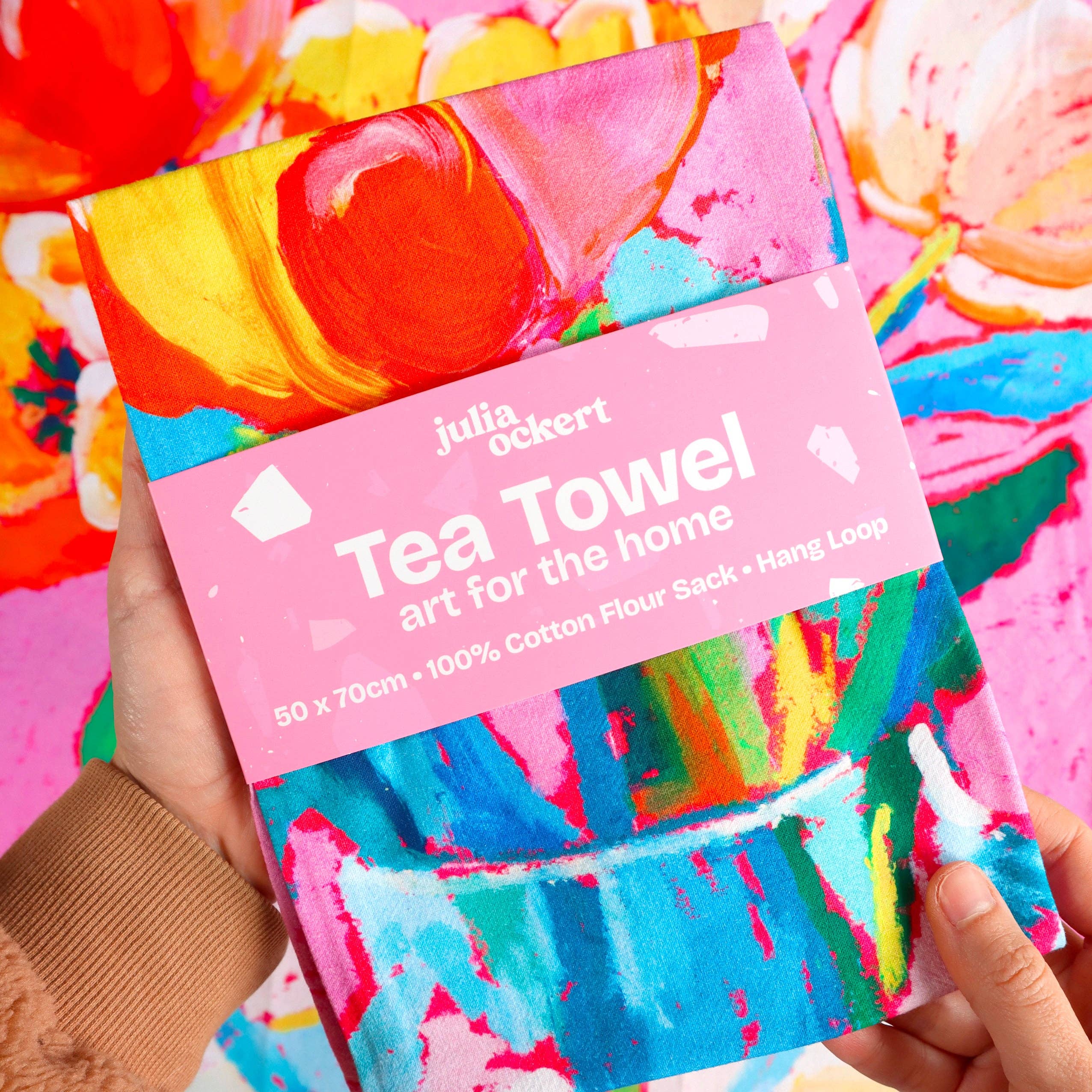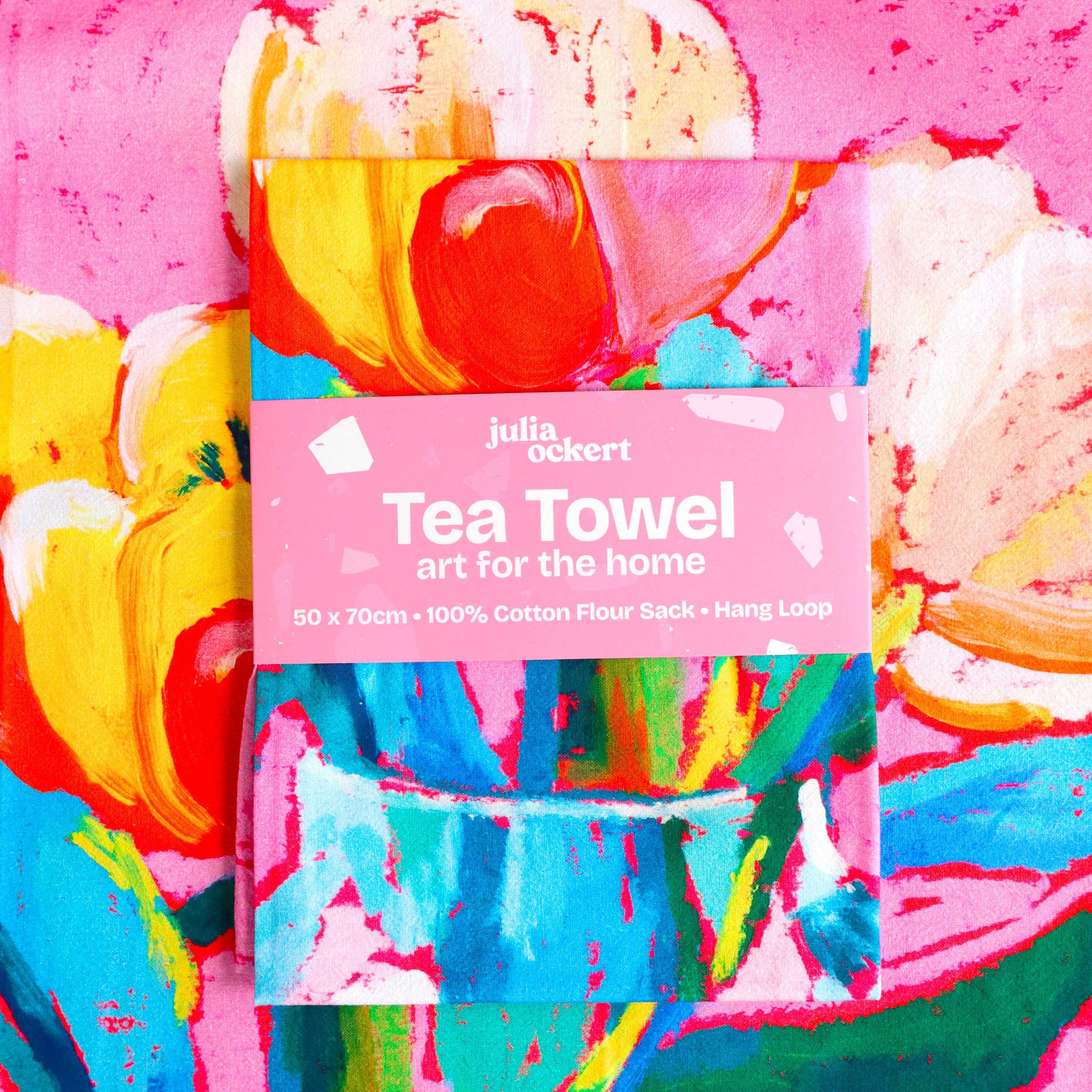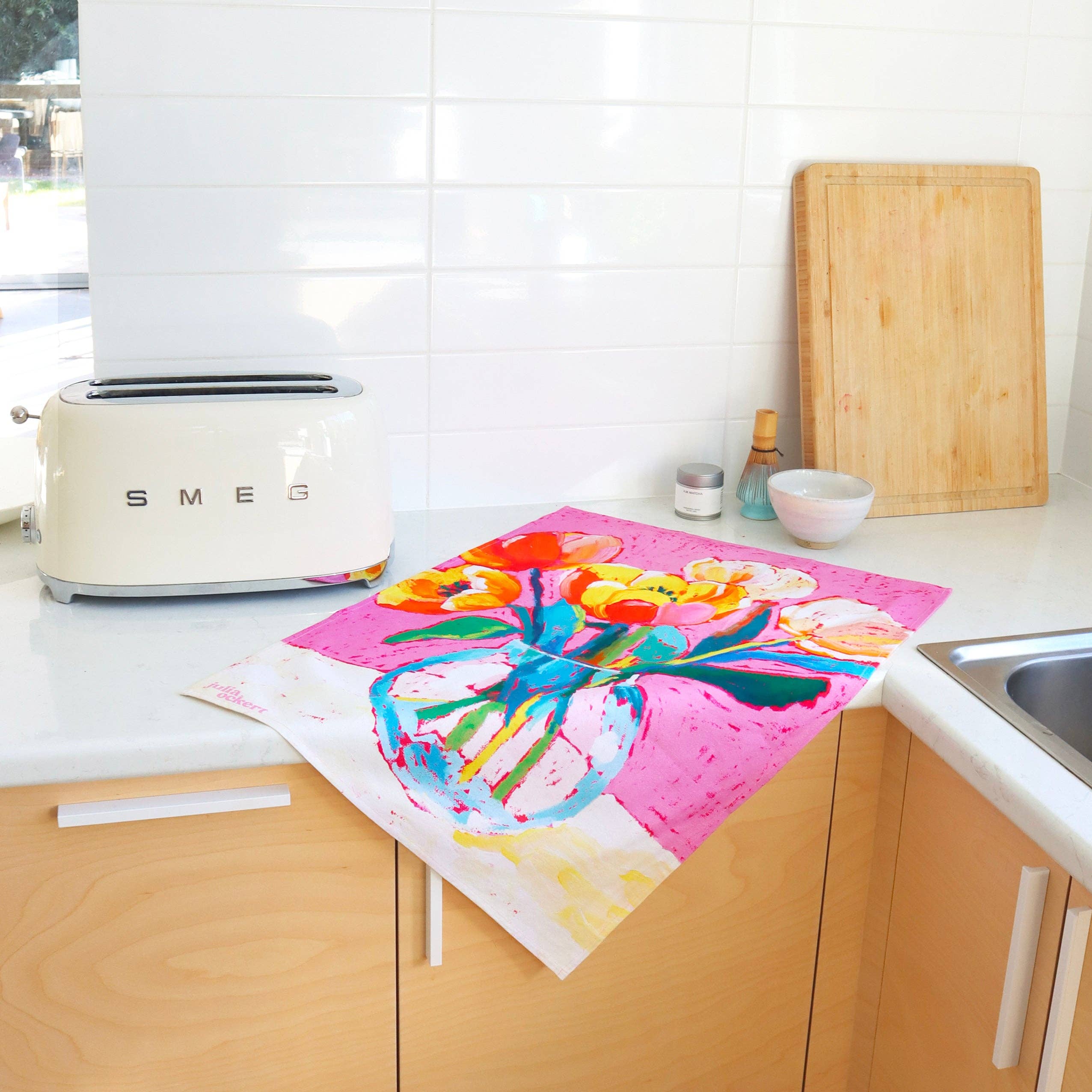 Add colour and joy to your customer's kitchen with this floral tea towel, featuring my original oil pastel artwork "Tulips On Pink". Printed on soft, absorbent 100% cotton flour sack with a convenient hang loop. This functional piece of art is perfect for brightening up a kitchen, wrapping a loaf of bread, or gifting to someone who loves vibrant, dopamine decor homewares.