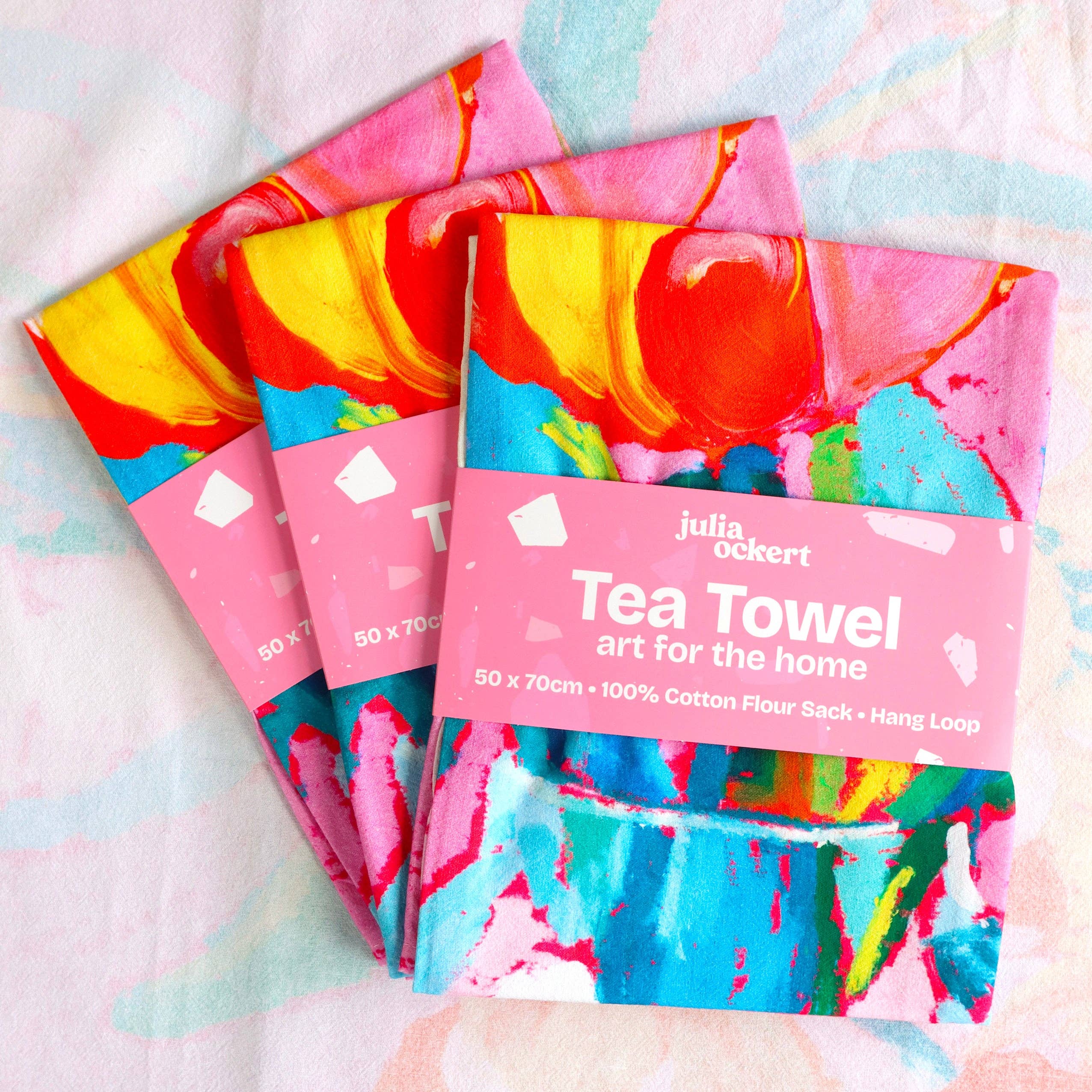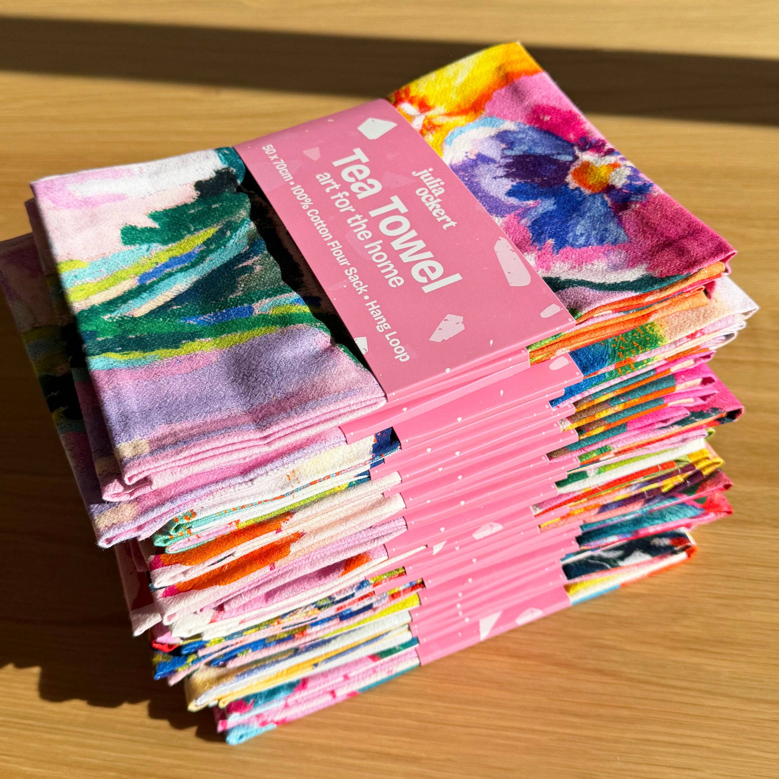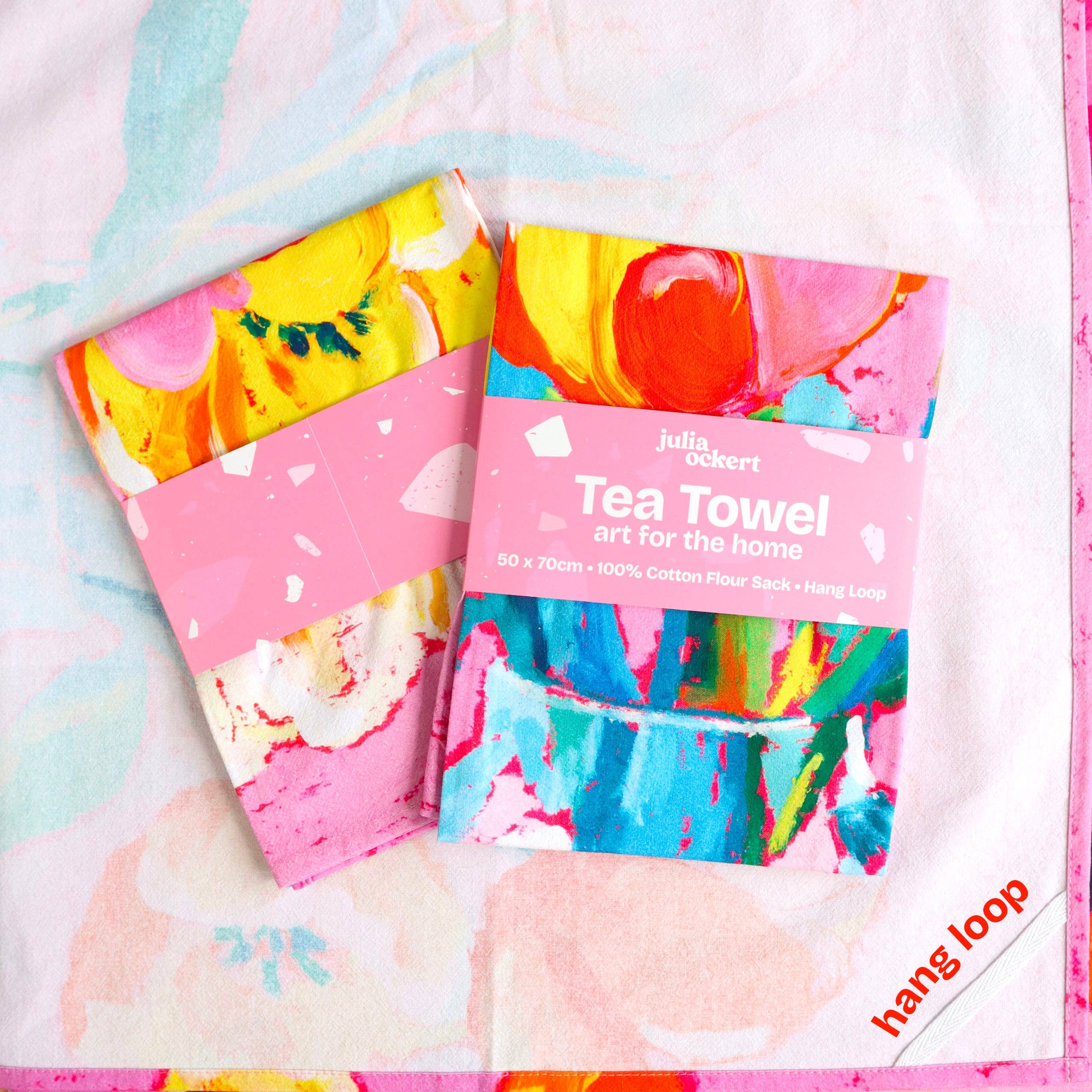 Add colour and joy to your customer's kitchen with this floral tea towel, featuring my original oil pastel artwork "Tulips On Pink". Printed on soft, absorbent 100% cotton flour sack with a convenient hang loop. This functional piece of art is perfect for brightening up a kitchen, wrapping a loaf of bread, or gifting to someone who loves vibrant, dopamine decor homewares.