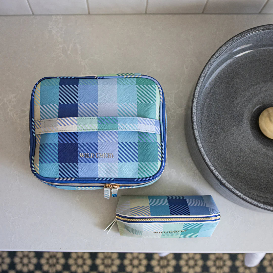 Our Large Blue Toiletry Bag is crafted from textured vegan leather and features gold accent zippers, an internal zipped pocket, custom printed lining, and a convenient handle for effortless carrying.