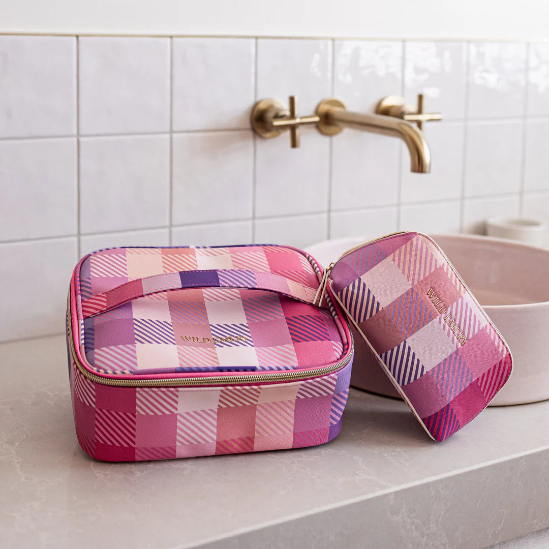 Our Large Pink Toiletry Bag is crafted from textured vegan leather and features gold accent zippers, an internal zipped pocket, custom printed lining, and a convenient handle for effortless carrying.
