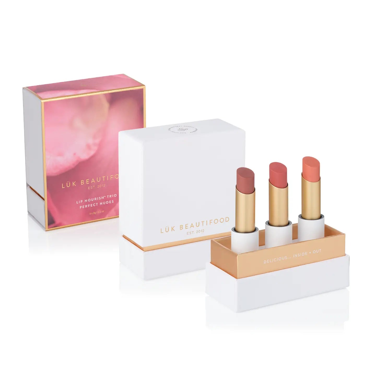 Create an effortless chic look with three different understated nudes of our best selling balmy natural lipstick. Perfect Nudes features universally flattering, neutral and wearable Lip Nourish™ shades in a luxurious new lip set. Ready to gift, each trio comes thoughtfully packaged with bespoke artwork and keepsake white box with gold foil.