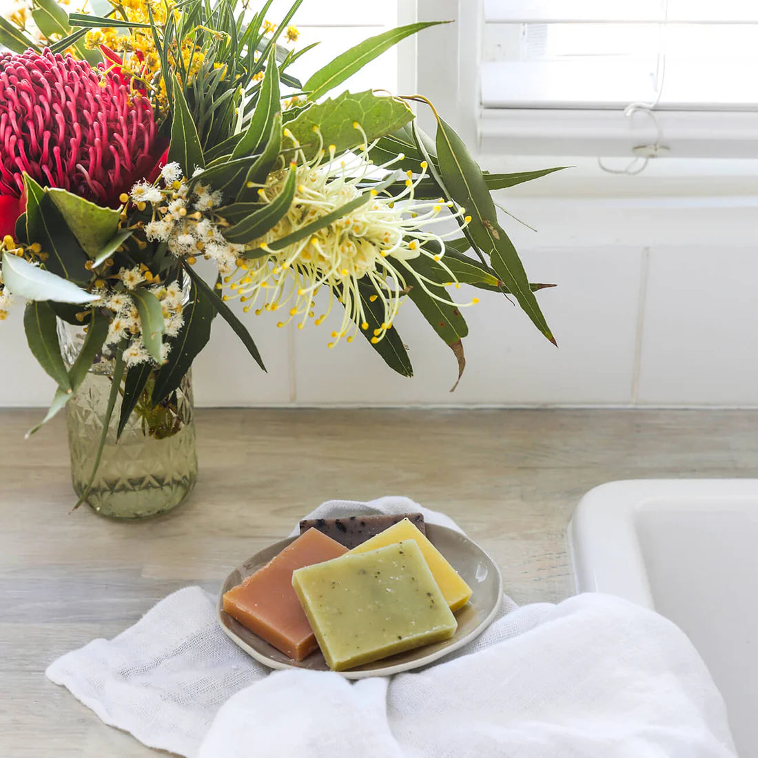 This lovely box of handmade olive oil soaps, made in the beautiful south-west of Western Australia, are fragranced with four different pure essential oil blends. All natural and palm oil free, enjoy the scents of Lemongrass, Eucalyptus Mint & Myrtle, Aniseed & Cinnamon and Rose Geranium. Featuring a striking arrangement of the Sturt Desert Pea, Mottlecah and Scarlet Banksia with a story of the origin of the Sturt Pea inside. A quintessential Australian souvenir this best seller makes a perfect and unique gift.