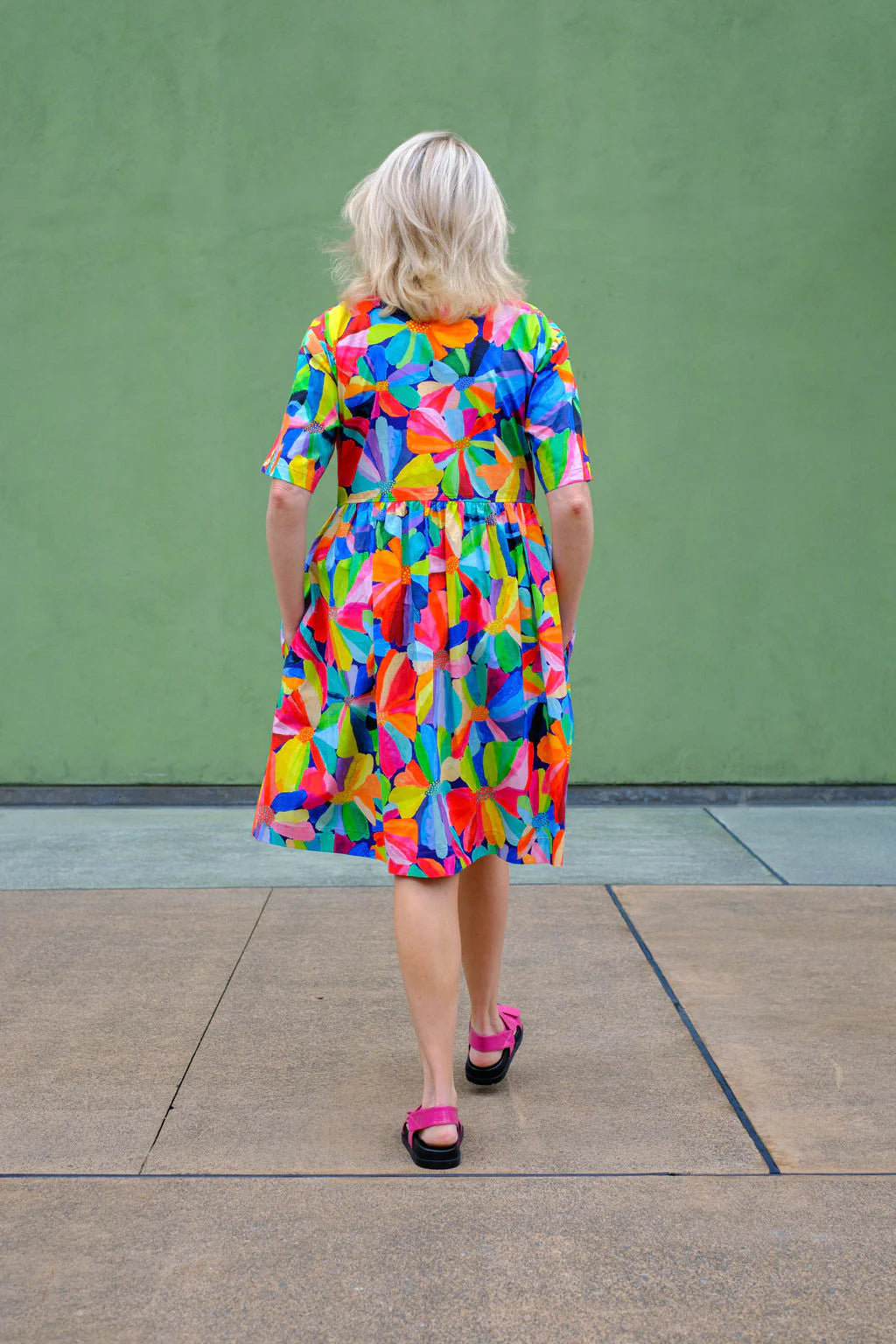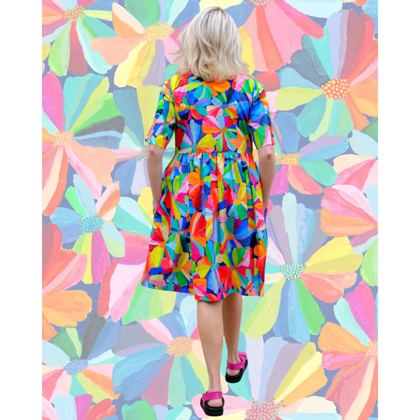 The dress finishes on the knee and includes practical large side seam pockets for added convenience. Each piece features exclusive Lordy Dordie "Petal Party" artwork, with print placement varying for a unique, one-of-a-kind design.