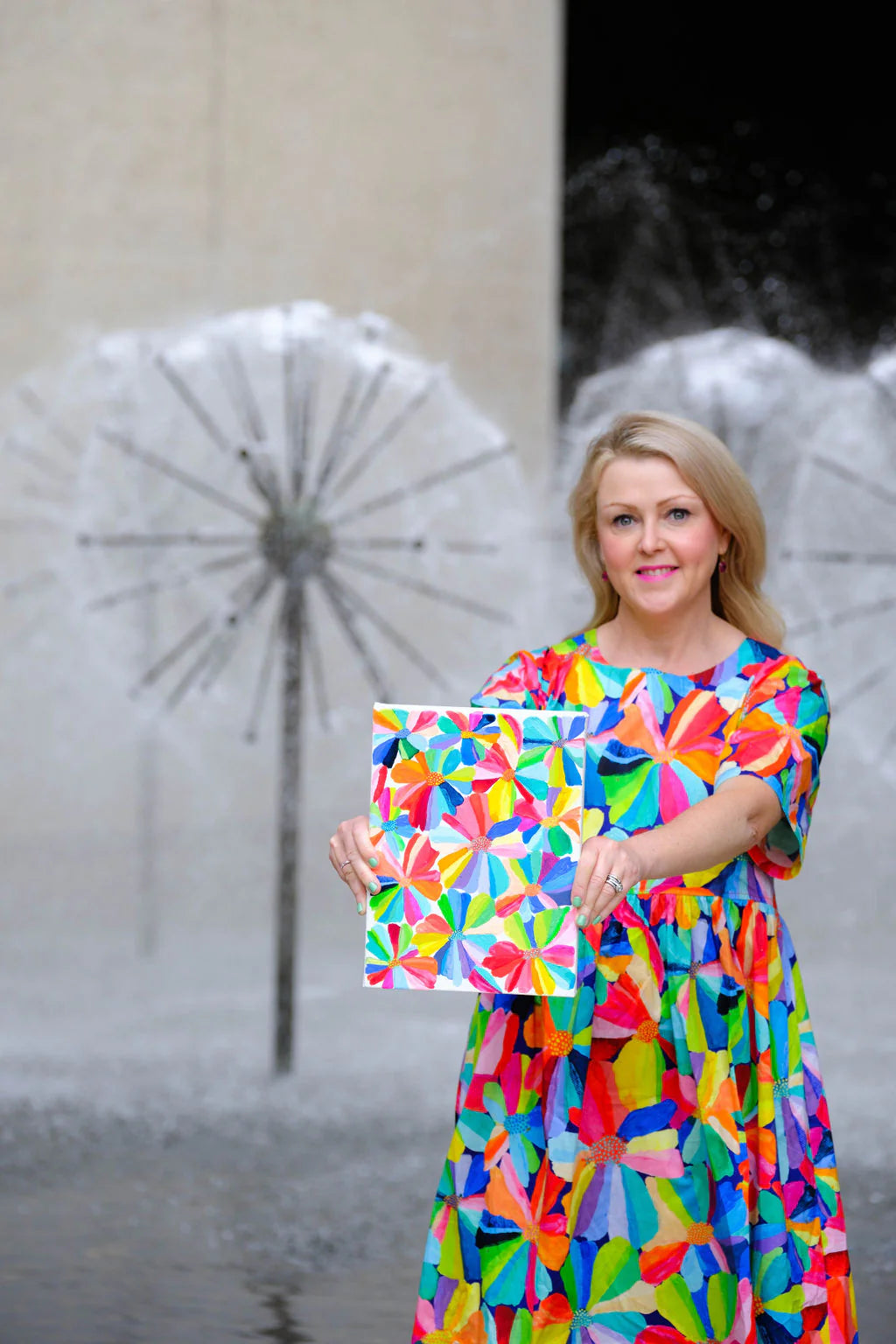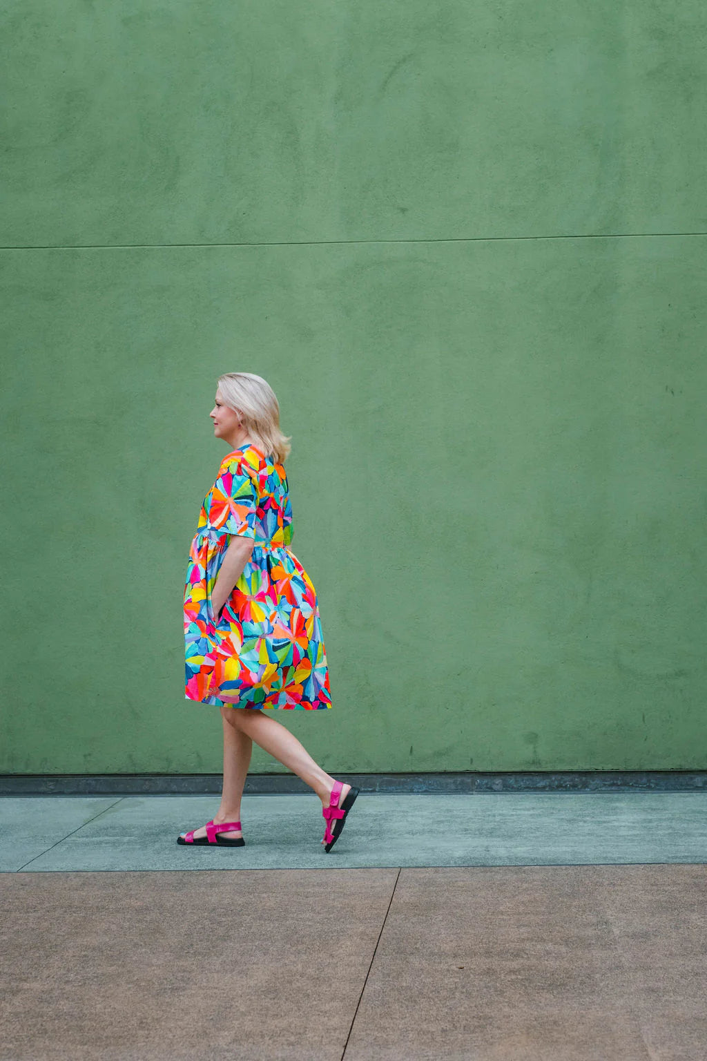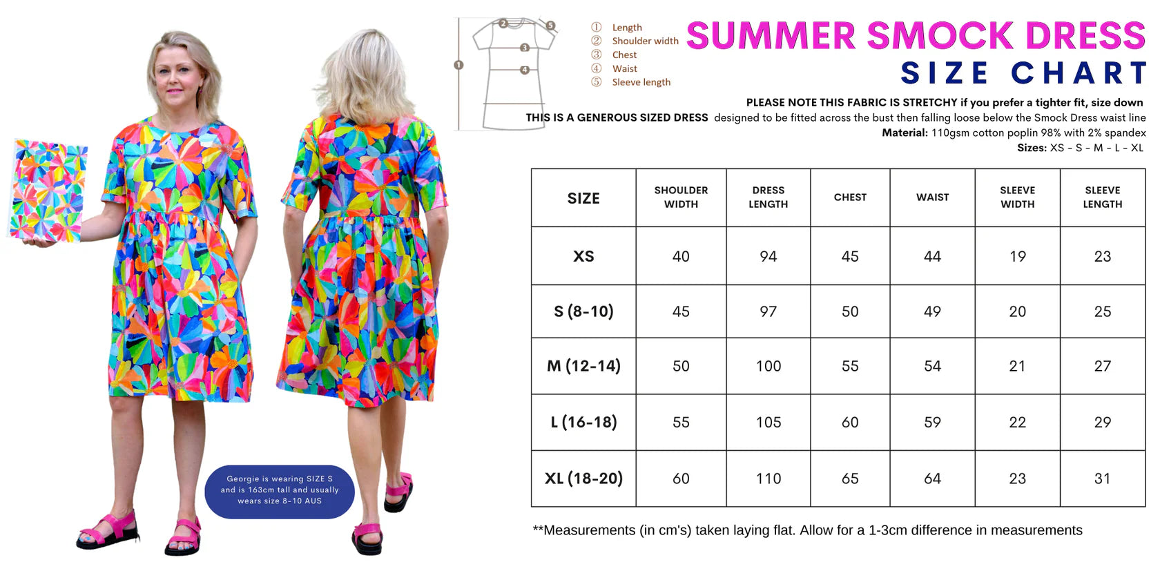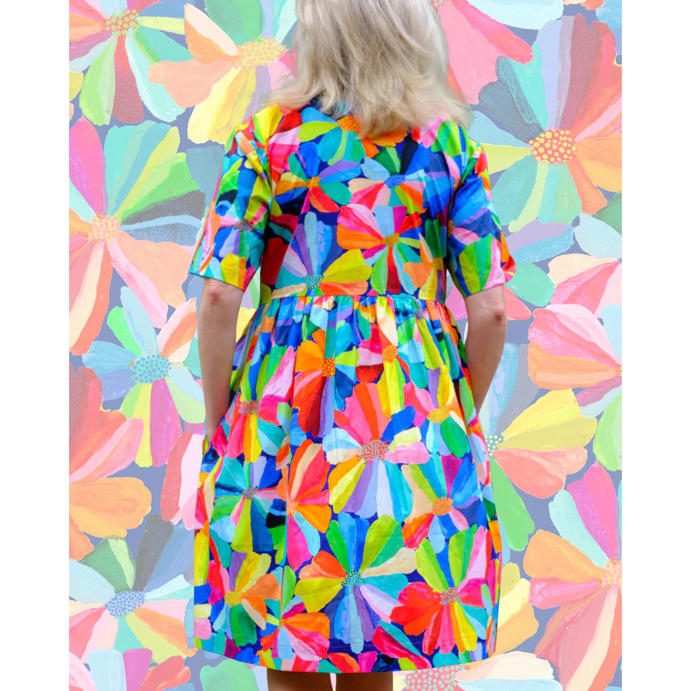 Brighten your wardrobe with the Petal Party Smock Dress, a celebration of intricately painted florals and bold colours, designed by Georgina Forbes of Lordy Dordie. Inspired by the beauty and vibrancy of nature, this dress showcases a stunning mix of blues, greens, and pinks that evoke joy and positivity.