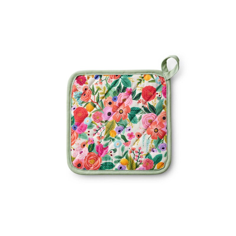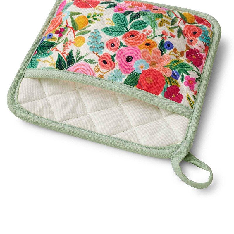 Protect your hands from hot pans with the quilted pot holder from Rifle Paper Co. Featuring contrast piping, a pocket for your hand, and a corner loop for hanging. Based in Winter Park, Florida, Rifle Paper Co. is a boutique stationery brand and design studio that features Anna Bond's sublime, whimsical designs and illustrations. Specialising in stunning cards, notebooks, paper goods and art prints, Rifle Paper Co. designs are rich with natural warmth and easy charm.